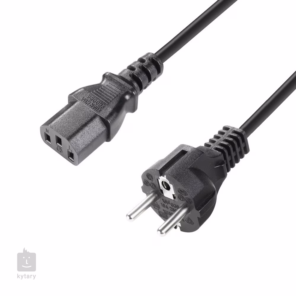 Zuverlässiges dreiadriges Stromversorgungskabel mit einem Querschnitt (pro Ader) von 0,75 mm², CEE 7/7 und IEC C13-Gabelklemmen.