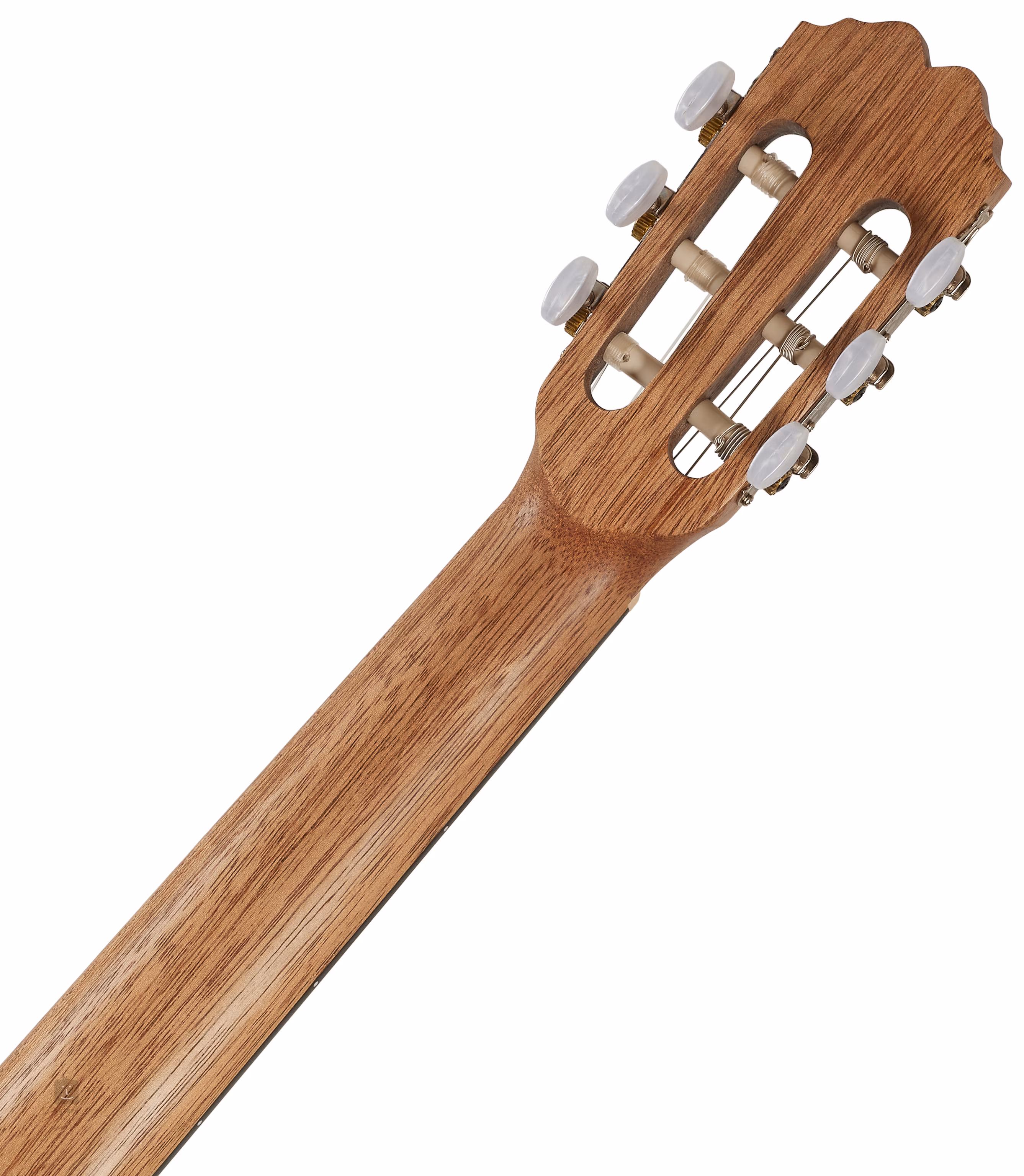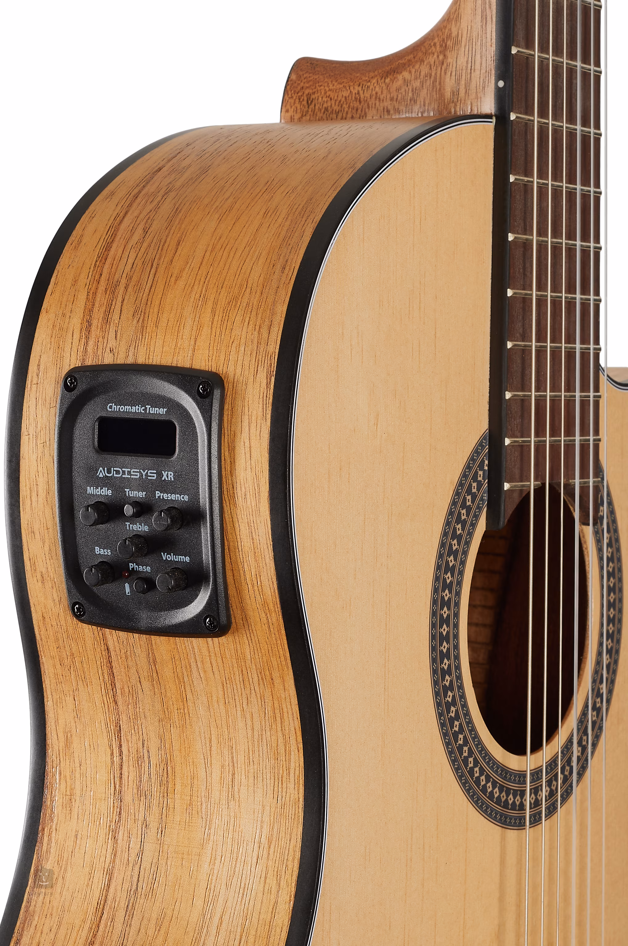 Die klassische elektroakustische Gitarre Admira Lena ist ein erschwingliches Instrument, das für Spieler aller Spielstärken geeignet ist. Die Vorderseite der Gitarre besteht aus laminiertem Ahorn, während der Boden und die Zargen aus laminiertem Kao/Amoora-Holz aus dem tropischen Südostasien gefertigt sind. Der Mahagonihals ist auf ein Griffbrett aus tropischem Teakholz geleimt, das auch für die Kopfplatte verwendet wird. Die Saiten sind in klassischen Stimmmechaniken aufgezogen. Die stilvolle Verarbeitung wird durch traditionelle Elemente in Form von Rosetten und Posamenten akzentuiert.