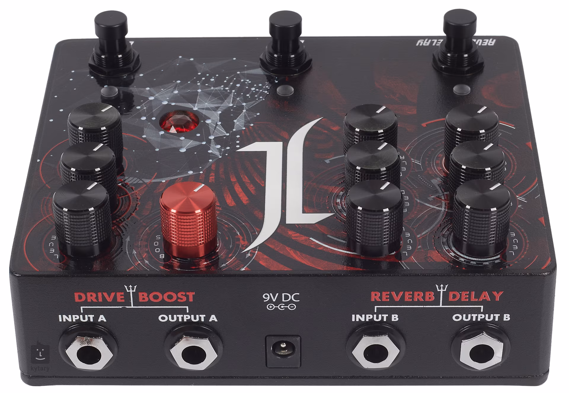 Die Drive-Sektion bietet ausdrucksstarke Overdrive- und High-Gain-Verzerrung, Boost-Signalanhebung bis zu 20 dB, Delay analoger Signalweg, digitale Verarbeitung und Regler für Lautstärke, Anzahl der Wiederholungen und Dauer des Delay-Effekts, Reverb Plattenhall und Regler für Lautstärke, EQ und Dauer des Reverb-Effekts.