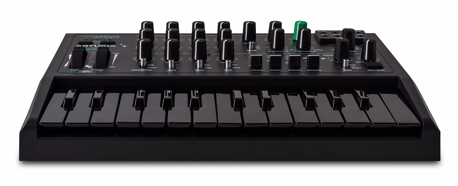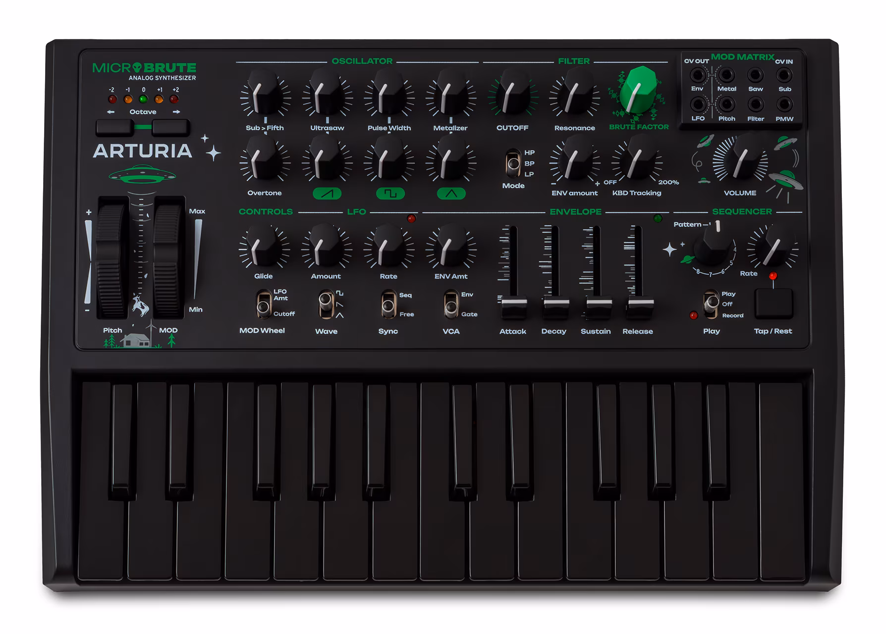 Der Arturia MicroBrute UFO Edition ist eine limitierte Version des beliebten analogen monophonen Synthesizers, der nicht nur durch seinen kosmischen schwarzen Look mit markanten grünen Details, sondern vor allem durch seinen authentischen Sound besticht. Das kompakte Instrument bietet eine vollständig analoge Signalkette, die mit einem einzigartigen VCO-Oszillator mit Wave-Mixing-Fähigkeit beginnt und über das legendäre Steiner-Parker-Multimode-Filter bis hin zur charakteristischen Brute Factor-Verzerrung reicht. So lassen sich aggressive Bässe, durchdringende Leads und experimentelle Klangtexturen erzeugen, die sofort erkennbar sind.