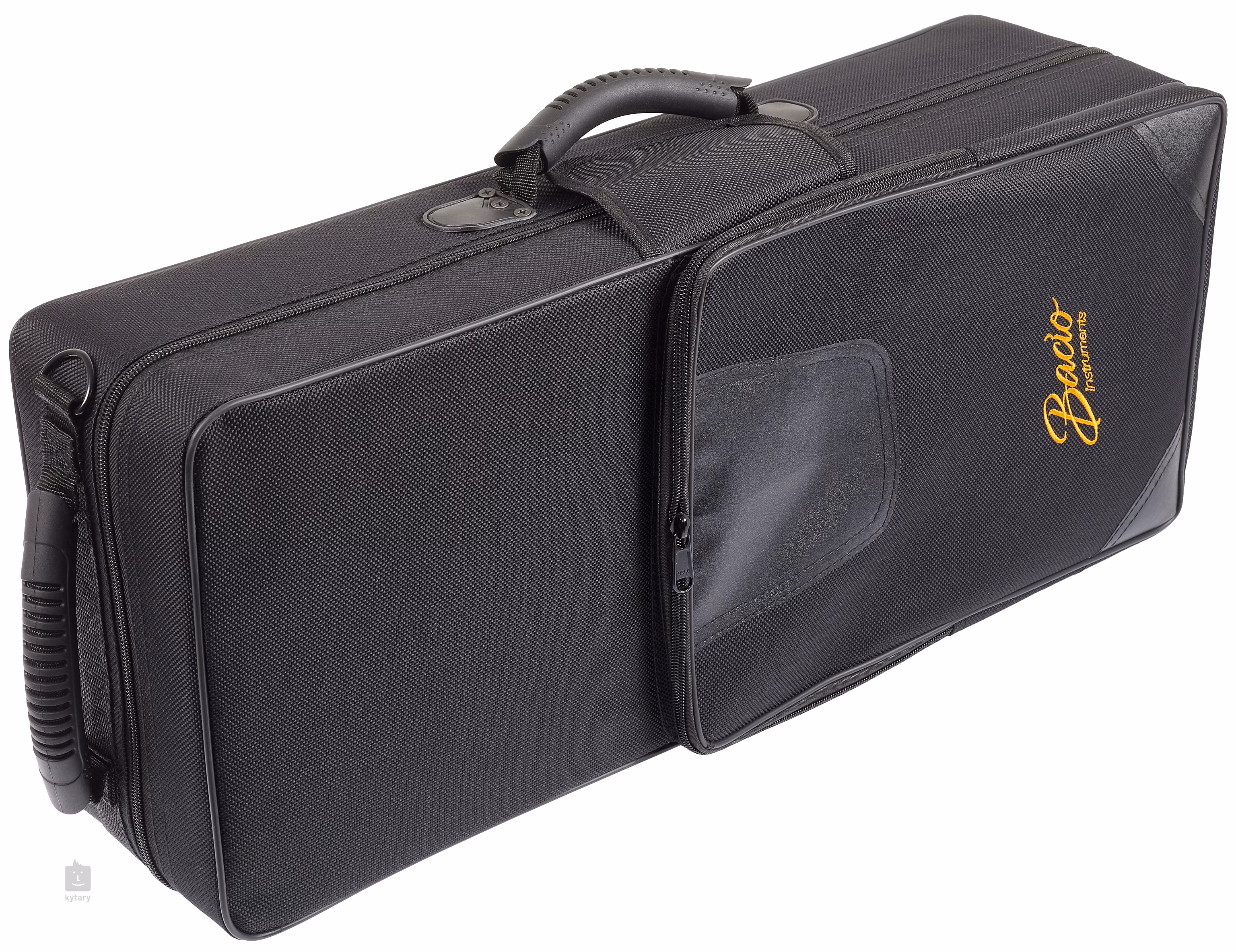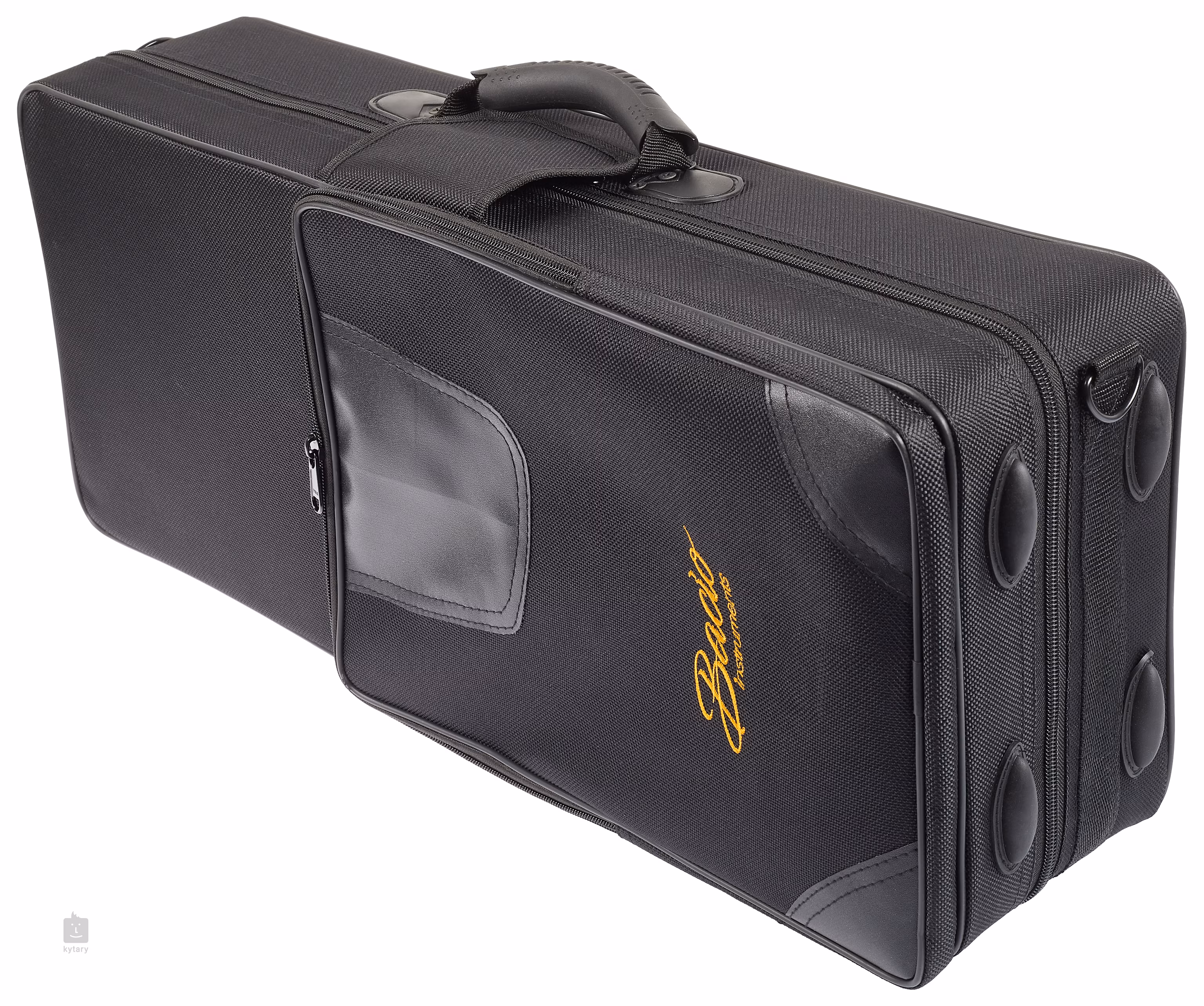 Altsaxophontasche aus strapazierfähigem Synthetikgewebe. In der Außentasche kann Zubehör verstaut werden.