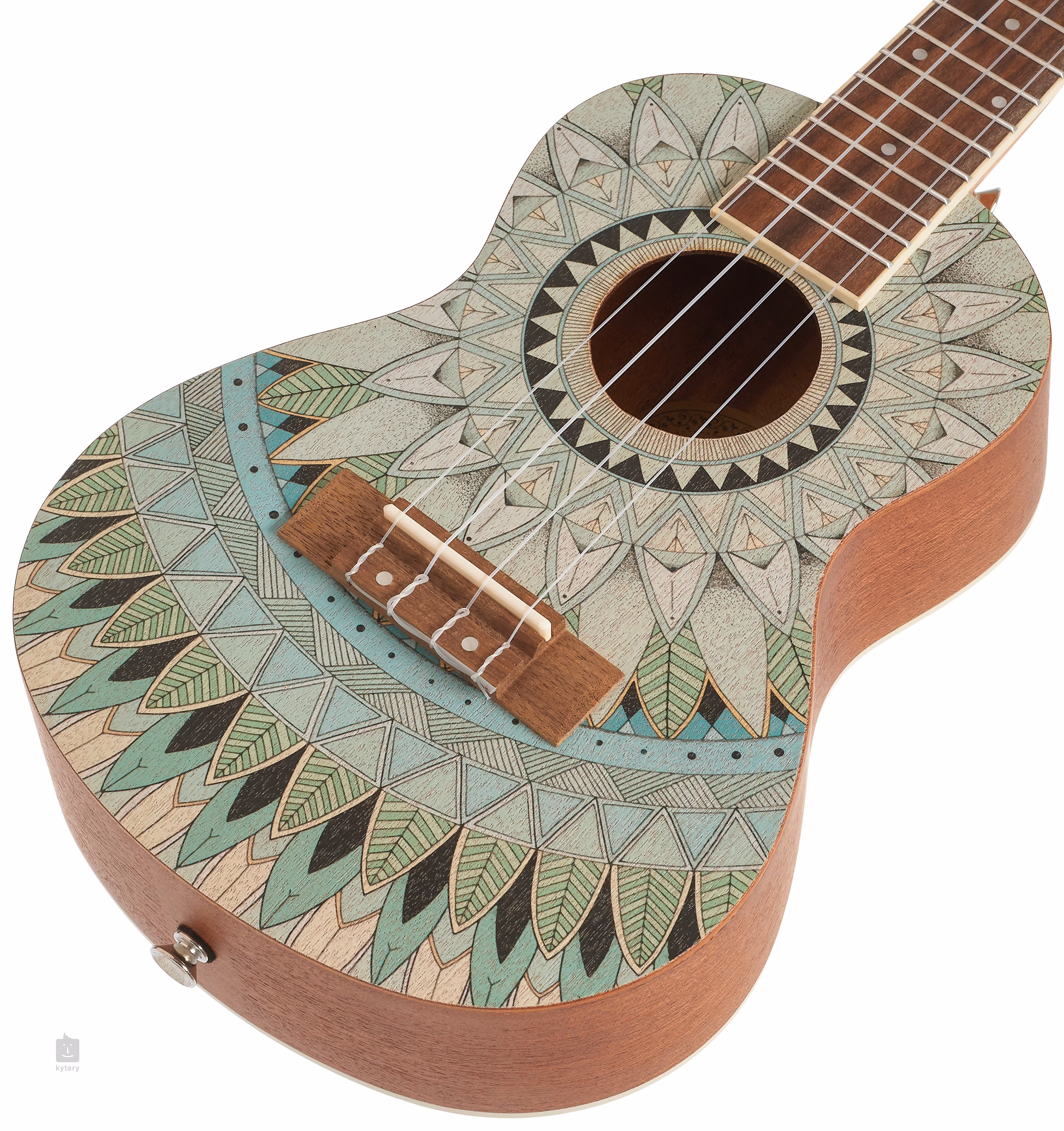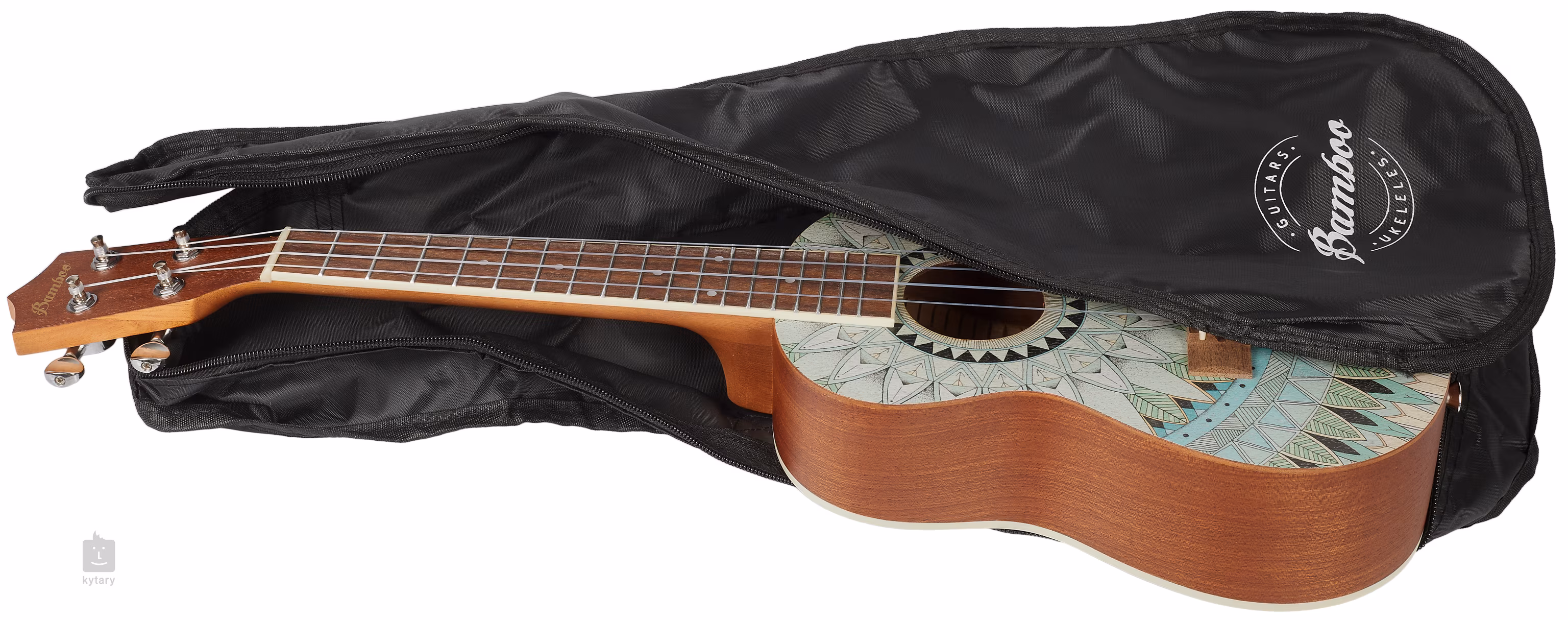 Die New Generation Linie von Bamboo bietet erschwingliche Ukulelen in Konzert- und Soprangröße, die mit farbenfrohen grafischen Motiven verziert sind. Die Konzert-Ukulele Jade hat einen Korpus aus laminiertem Sapelholz, einen Okoumé-Hals, ein Griffbrett aus Walnussholz und eine Knochensaitenaufhängung über dem Nullbund in einer offenen Gitarrenstimmung. Das Instrument wird in einem Koffer geliefert.