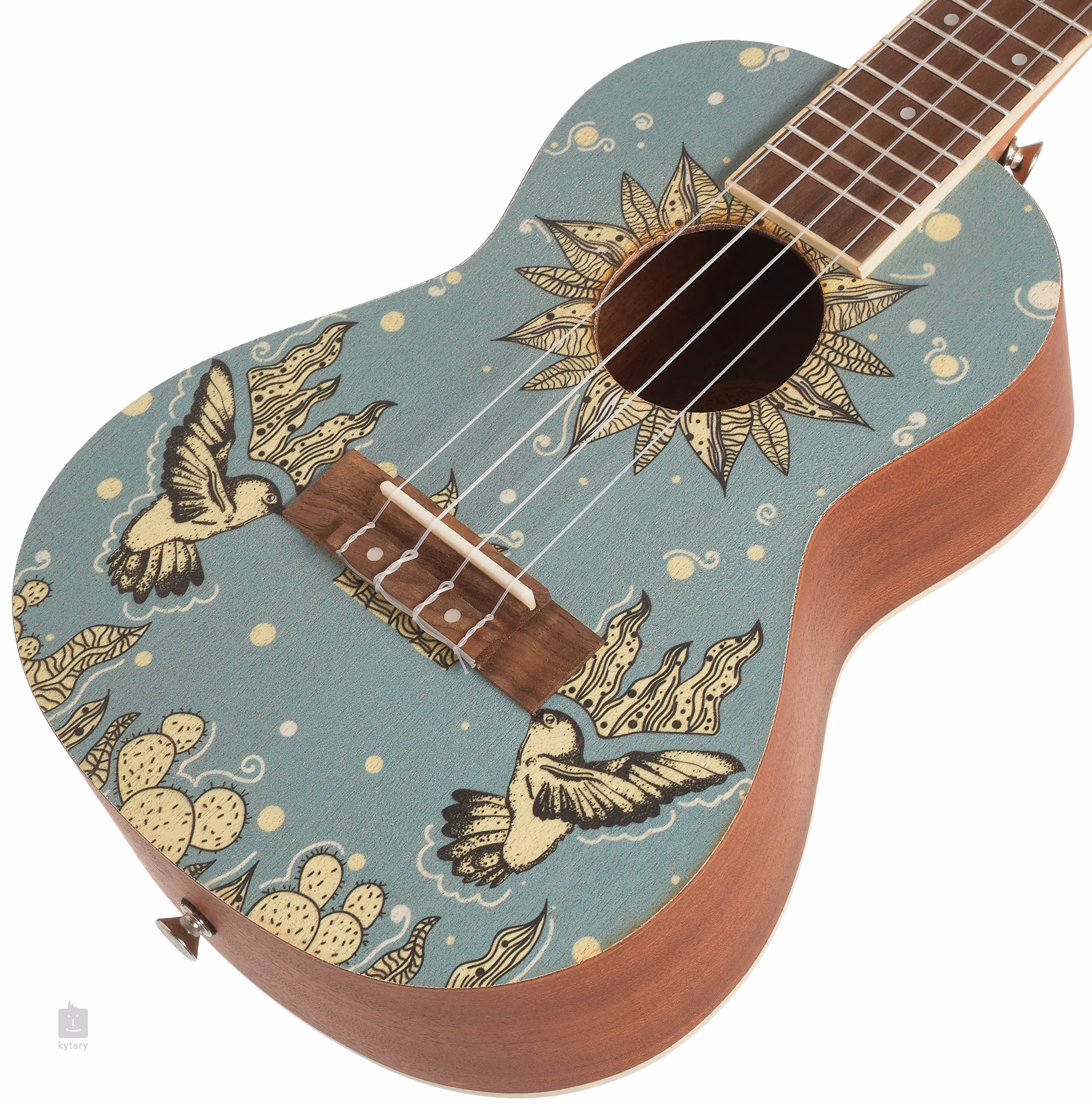 Die New Generation Linie von Bamboo bietet erschwingliche Ukulelen in Konzert- und Soprangröße, die mit farbenfrohen grafischen Motiven verziert sind. Die Konzert-Ukulele Sky hat einen Korpus aus laminiertem Sapelholz, einen Okoumé-Hals, ein Griffbrett aus Walnussholz und eine Knochensaitenaufhängung über dem Nullbund in einer offenen Gitarrenmechanik. Das Instrument wird in einem Koffer geliefert.