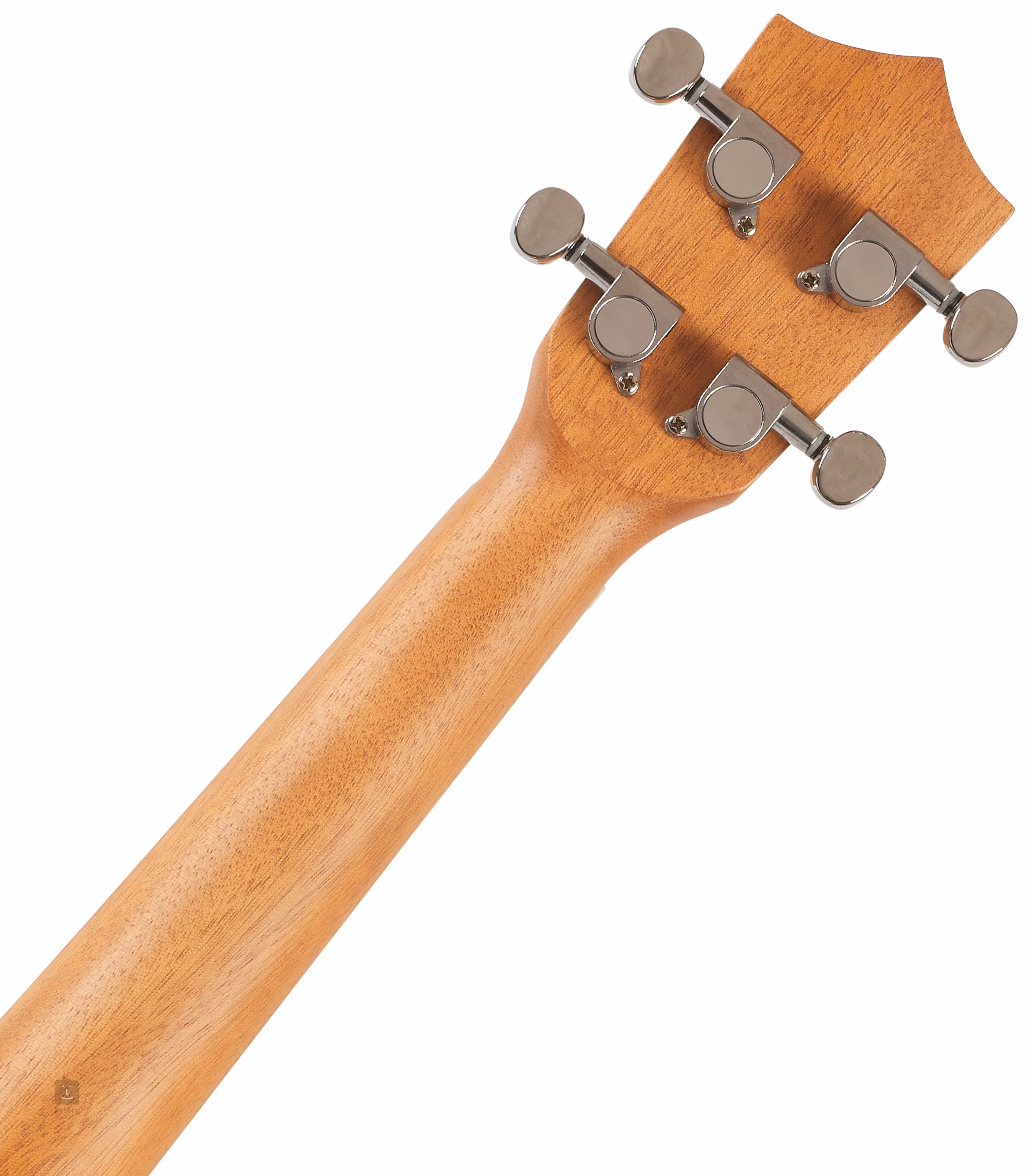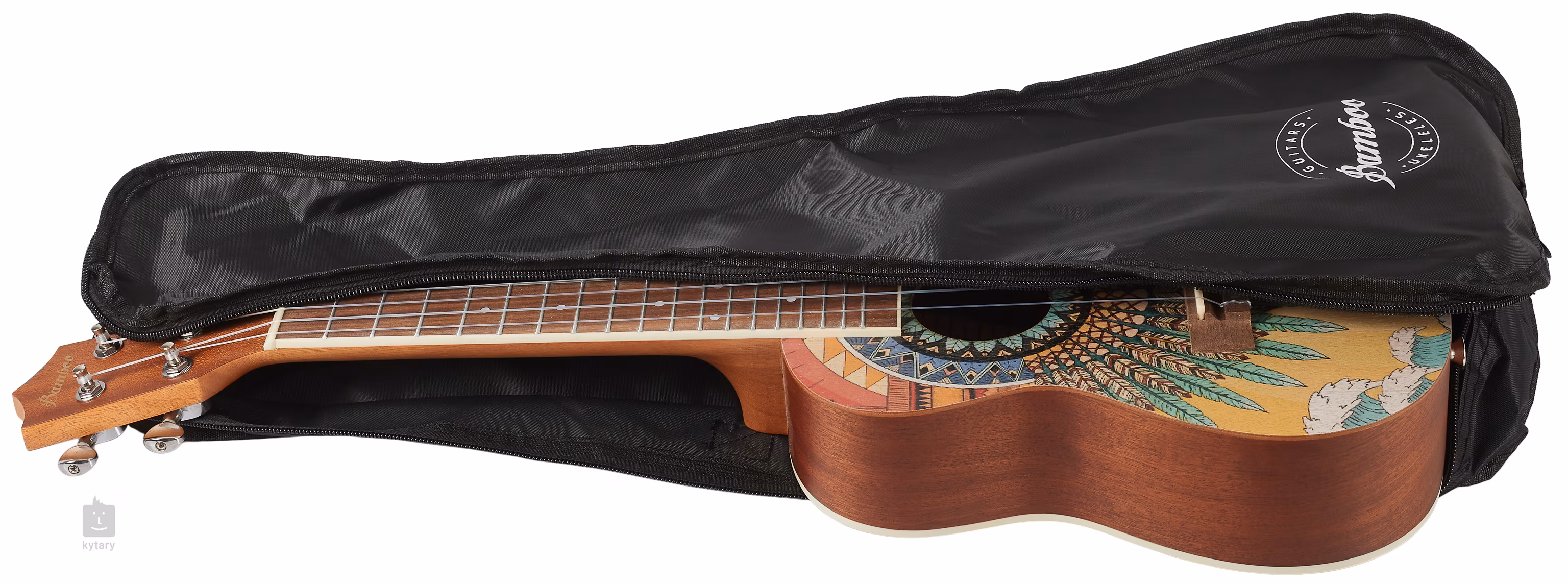 Die New Generation Linie von Bamboo bietet erschwingliche Ukulelen in Konzert- und Soprangröße, die mit farbenfrohen grafischen Motiven verziert sind. Die Sunshine-Konzert-Ukulele hat einen Korpus aus laminiertem Sapelholz, einen Okoumé-Hals, ein Griffbrett aus Walnussholz und eine Saitenaufhängung aus Knochen über dem Nullbund in einer offenen Gitarrenstimmung. Das Instrument wird in einem Koffer geliefert.