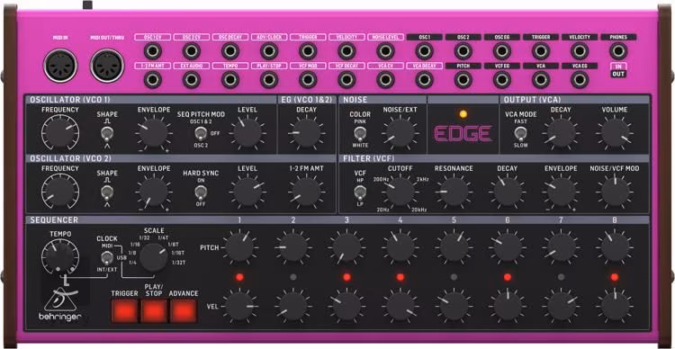 Der Behringer EDGE ist ein analoger semi-modularer Percussion-Synthesizer mit zwei Oszillatoren, Multimode-Filter, zwei 8-Step-Sequenzern und der Möglichkeit, bis zu 16 Geräte gleichzeitig zu verketten.