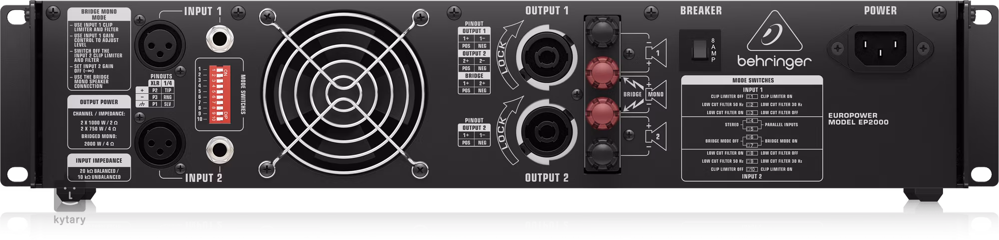 Der Behringer EP2000 ist ein zweikanaliger Class-AB-Verstärker mit hochwertiger Audiowiedergabe, leisem Betrieb und hoher Ausgangsleistung, die für Club- und Outdoor-Konzerte und -Veranstaltungen ausreicht. Er bietet einfache Bedienelemente in Form von separaten Kanal-Lautstärkereglern, Signalanzeige und Clipping, Verstärker-Mod-Schalter (Stereo, Bridge, Limiter und Hochpassfilter), separate XLR- und 6,3 mm-Klinkeneingänge und zwei Speakon-Ausgänge.
