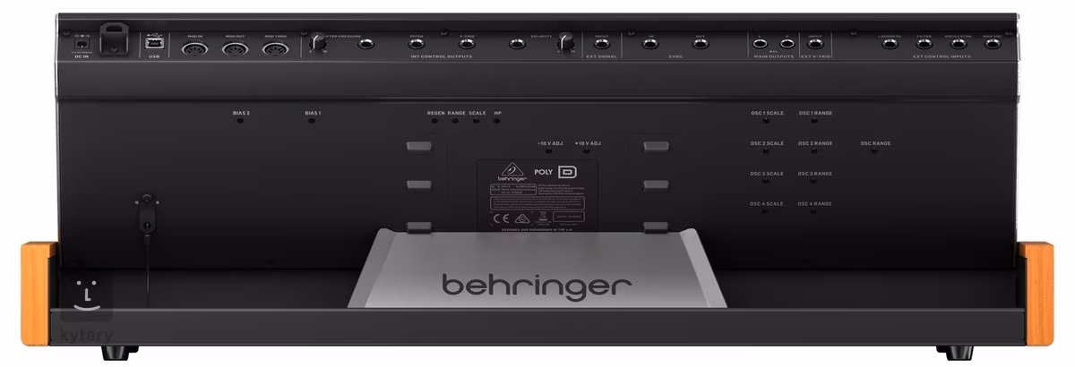 Der zweite Teil des Poly-D ist ein flexibles Anschlussfeld für unzählige Kombinations- und Verkabelungsmöglichkeiten. Alle Anschlüsse auf der Rückseite sind klar beschriftet, und Sie können die Line-Eingänge und -Ausgänge ebenso nutzen wie die MIDI-Anschlüsse, einen Kopfhörerausgang mit separatem Lautstärkeregler, Anschlüsse für Expression-Pedale und einen USB-Anschluss für die Verbindung mit einem PC.