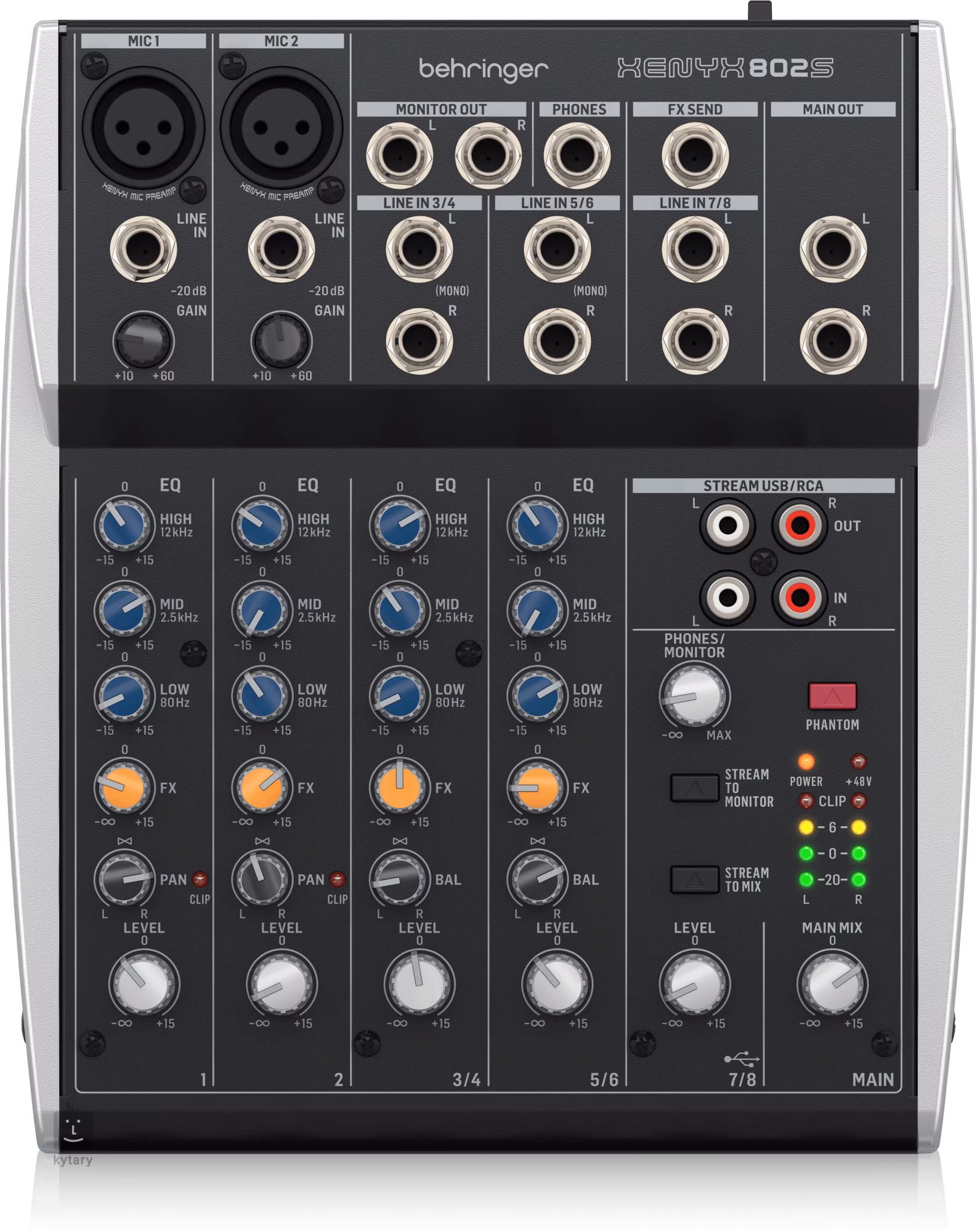 Das Behringer XENYX 802S ist ein analoges Mischpult, das sich für Streaming, Podcasting oder Aufnahmen eignet. Es verfügt über zwei Mono- und drei Stereokanäle (zwei mit EQ), den warmen und musikalischen Klang der XENYX-Mikrofonvorverstärker, ein Stereo-USB-Audiointerface für den Anschluss an PC und mobile Geräte, einen Dreiband-Equalizer, eine direkte Mischung von PC-/Gaming-Sounds über den Stereo-Cinch-Streaming-Ausgang, Stereo-Cinch-Eingang, der dem Hauptmix/Ausgang oder den Kopfhörer-/Monitorausgängen zugewiesen werden kann, automatisches Umschalten des Stereokanals 7/8 zwischen Klinkeneingang und USB-Wiedergabe und FX-Send-Steuerung für externe Effektprozessoren/Monitoring-Mix.