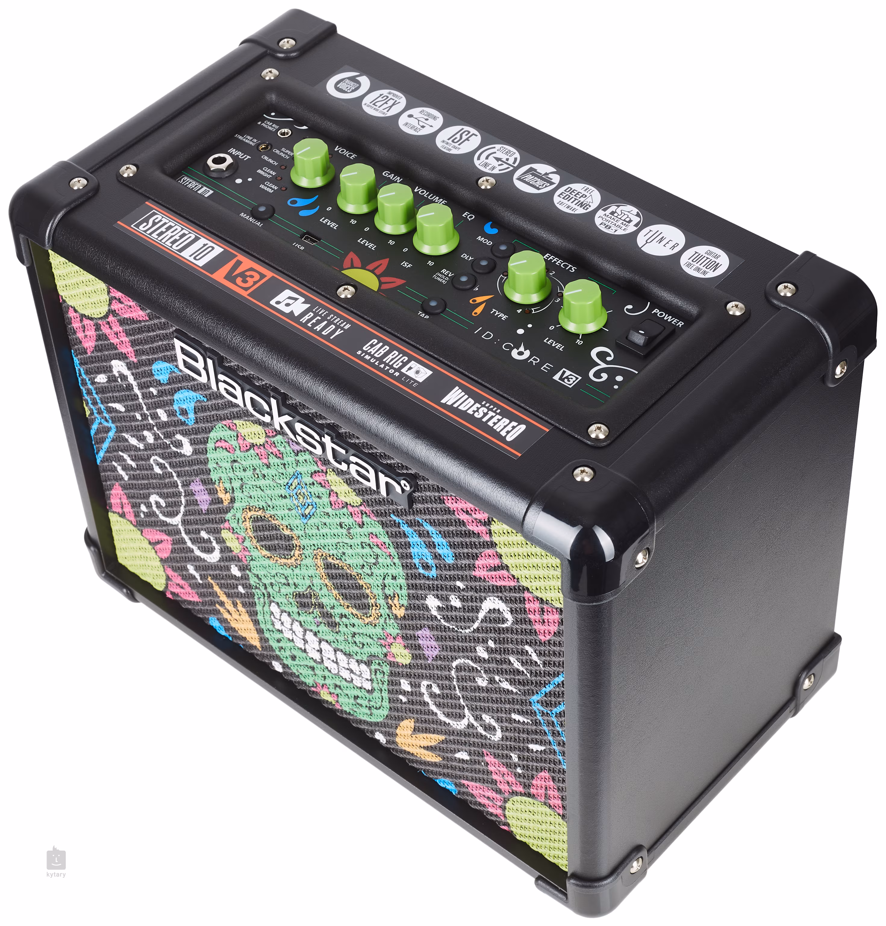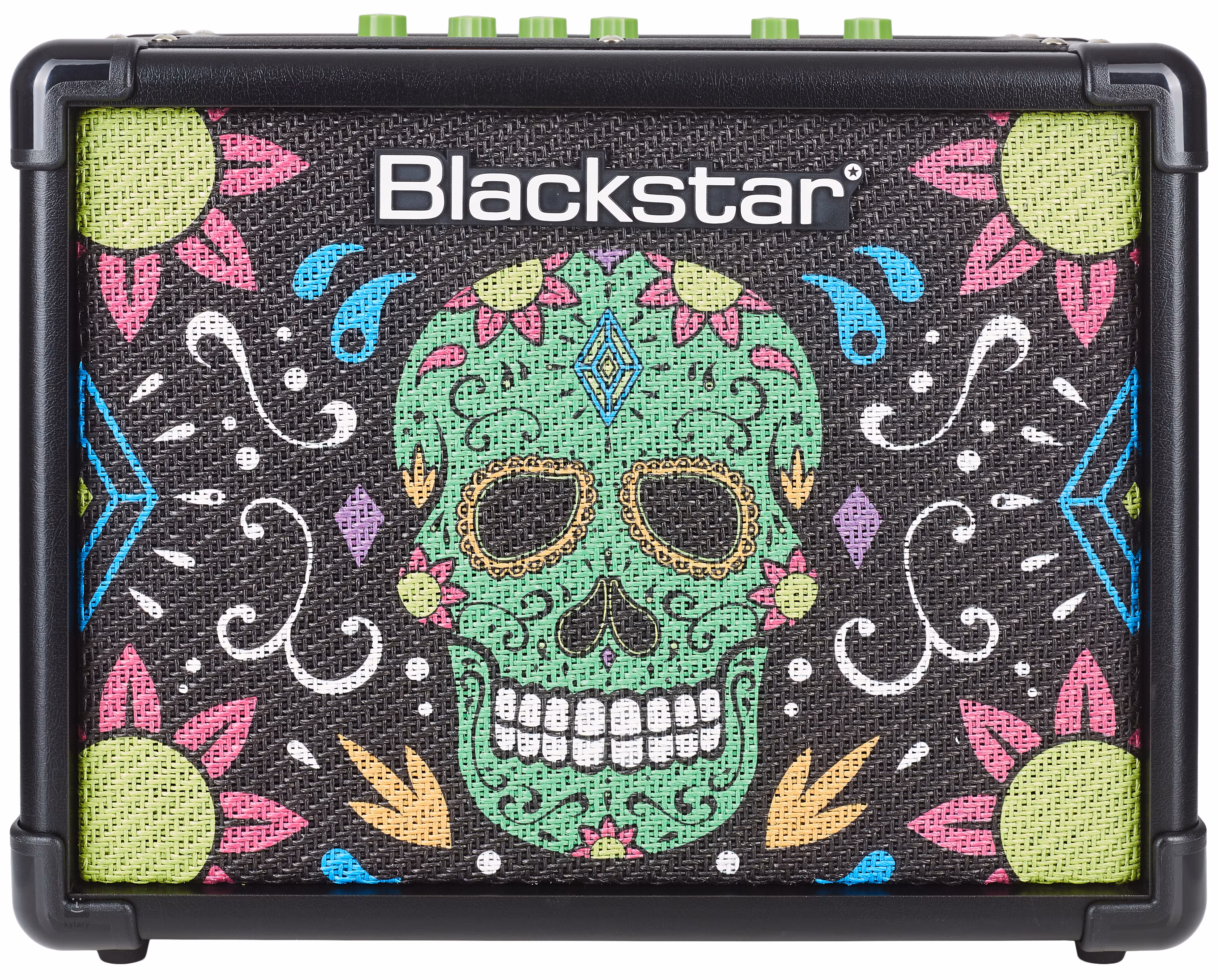 Die Frontplatte und das Bedienfeld des ID:Core 10 V3 Sugar Skull 3 Guitar Modeling Combo der britischen Marke Blackstar sind mit einem farbenfrohen Design (Sugar Skull) verziert, dessen Hauptmotiv ein Totenkopf ist, das Symbol des mexikanischen Tags der Toten, das in der zeitgenössischen Popkultur häufig verwendet wird (von Tattoos bis zu Street Art).