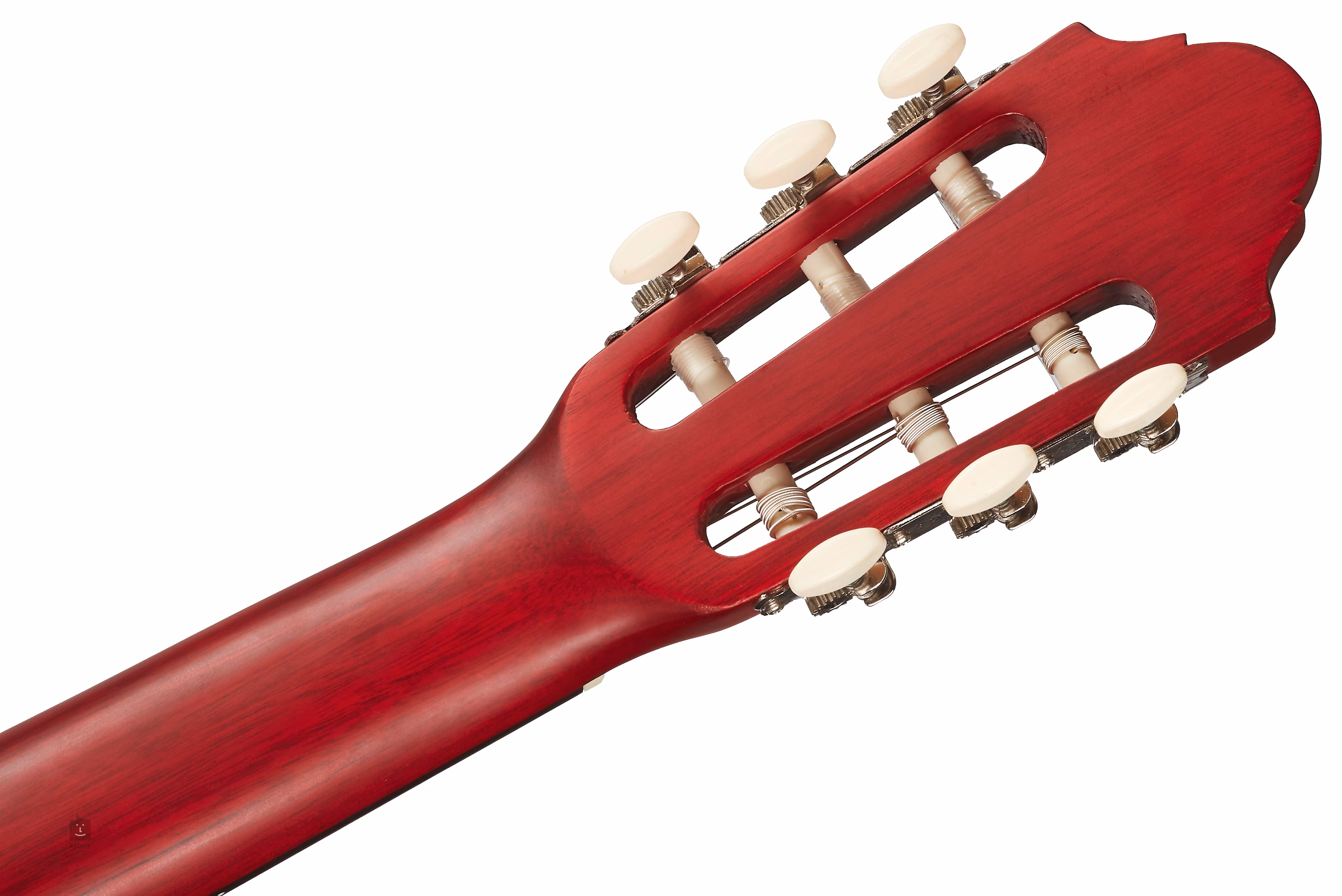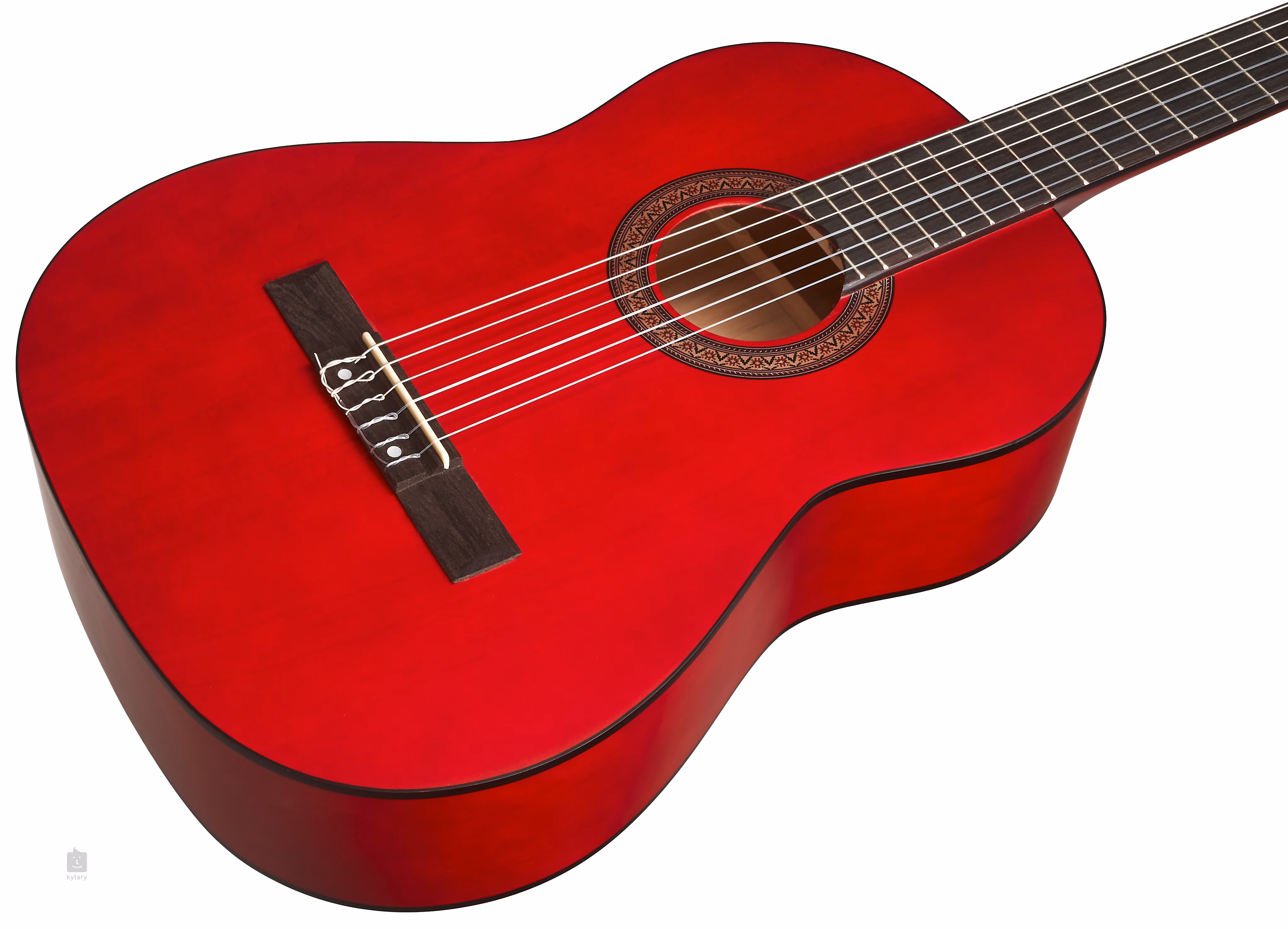 Der Korpus des Instruments ist aus Lindenholz gefertigt. Der Hals aus Nato-Holz hat ein Griffbrett aus ebonisiertem Holz mit neunzehn Bünden. Die Mensur und die Breite des Nullbundes entsprechen den Standardmaßen von 4/4-Klassikgitarren, so dass Sie keine Probleme haben werden, wenn Sie auf ein anderes, d.h. teureres Modell der klassischen Gitarre umsteigen.
