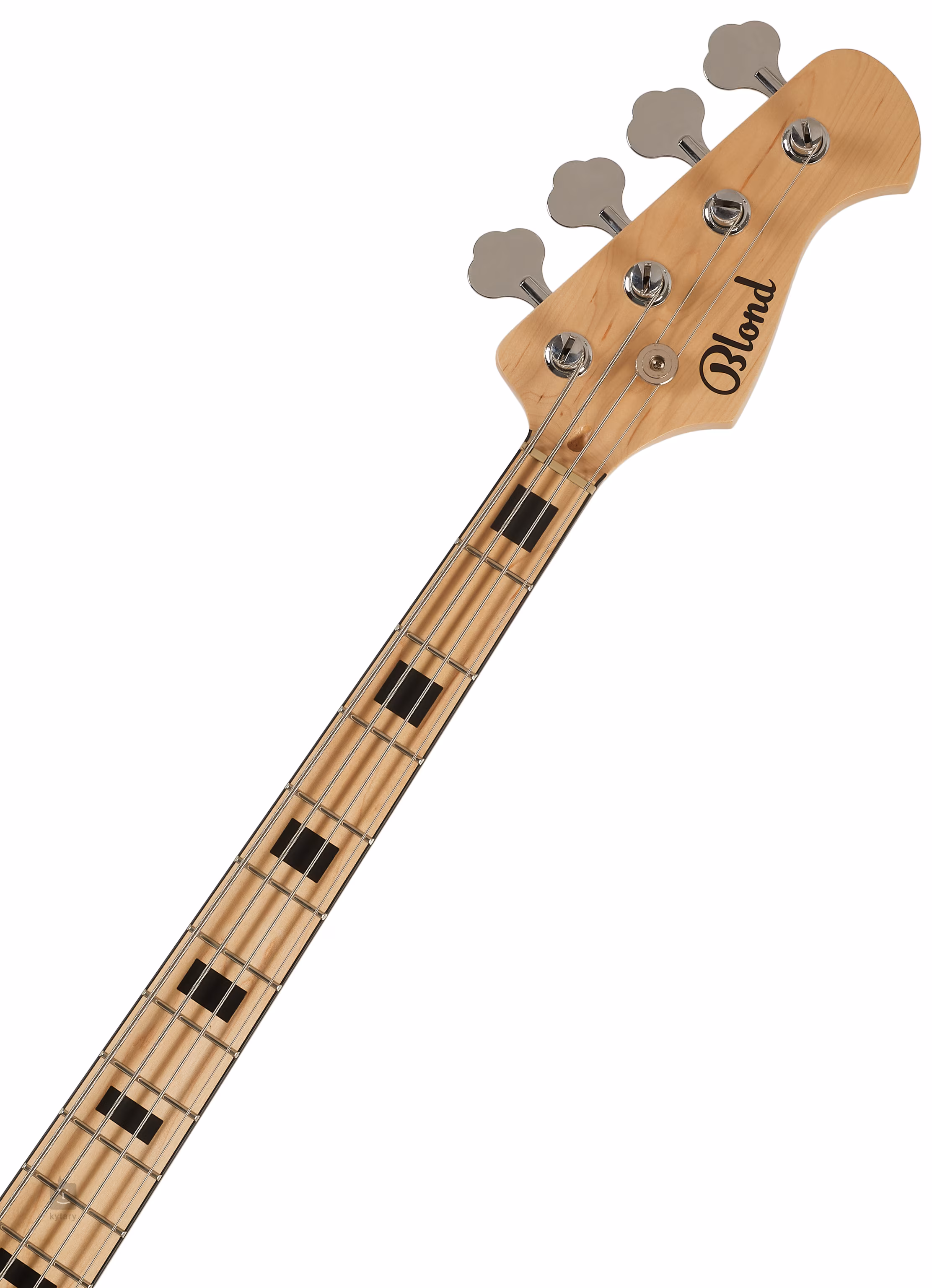 Der JAB-2 MN E-Bass aus der Vintage-Serie von Blond bietet einen authentischen, von legendären Aufnahmen inspirierten Sound. Der naturbelassene Eschenkorpus wird durch einen geschraubten Ahornhals mit einem 20-Bund-Griffbrett und dem markanten Skunk Stripe-Boden ergänzt. Schwarze Blockintarsien und schwarzes Halsbinding verleihen dem Instrument einen eleganten Look.