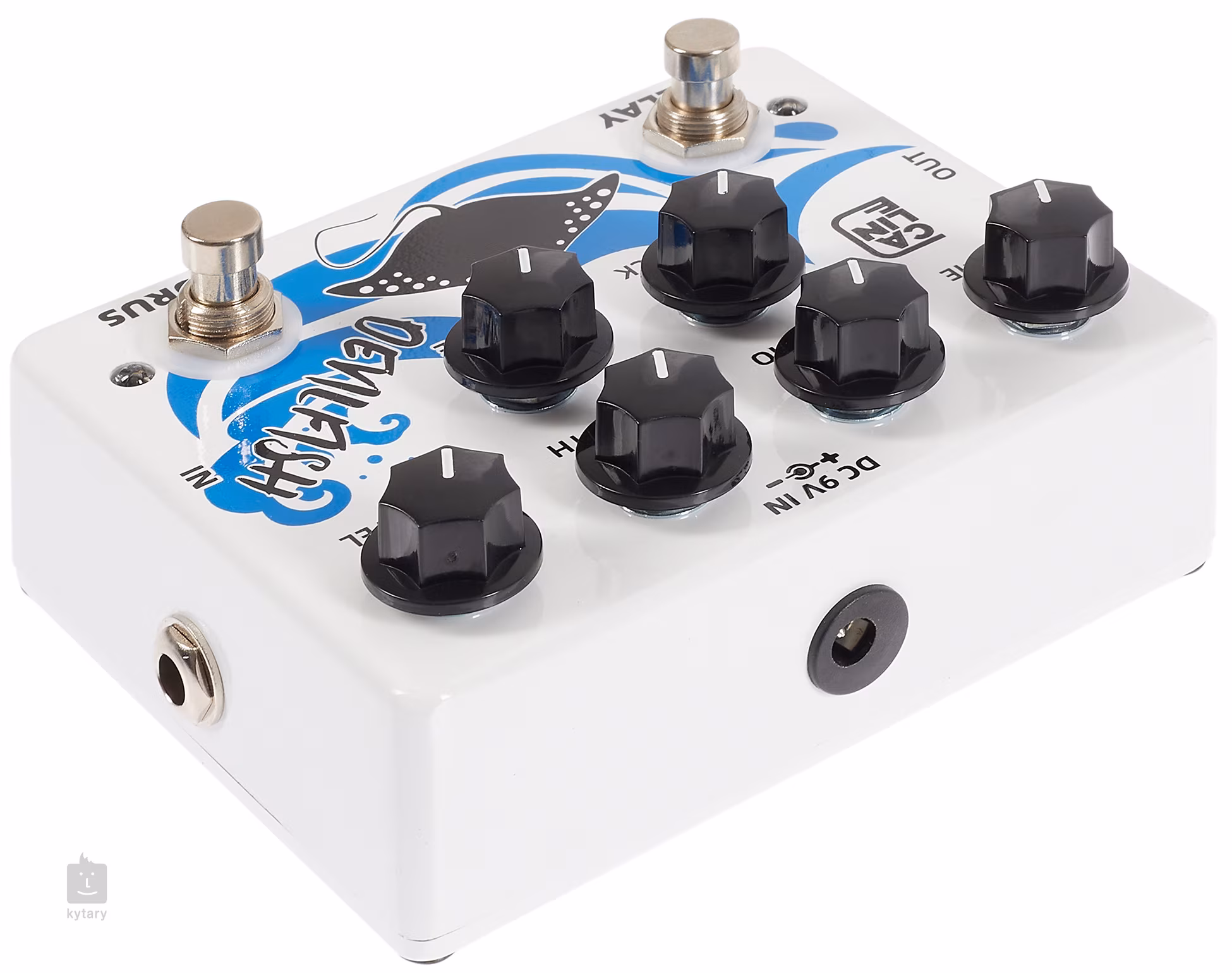 Das Caline Devilfish Effektpedal kombiniert ein klassisches Chorus-Pedal mit dem Caline CP-41 Ghost Rain Delay/Reverb-Effekt in einem Gehäuse. Die Delay-Sektion bietet natürlich klingende Echo-/Reverb- sowie Long-Delay-Effekte mit mehrfachen Wiederholungen/Oszillationen und klanglichen Ambient-Flächen (25 - 600 ms Verzögerungszeit), der zweite Pedal-Schaltkreis bietet einen vollwertigen Surround-Sound-Chorus-Effekt, mit dessen Zugabe man eine ausgeprägte Oszillation mit bereits hörbarer Verstimmung, den sogenannten "Sea Sick"-Effekt, erreicht. Beide Schaltungen können separat oder gleichzeitig verwendet werden, wobei sich ihre Klänge zu eindrucksvollen modulierten Raumflächen verbinden.
