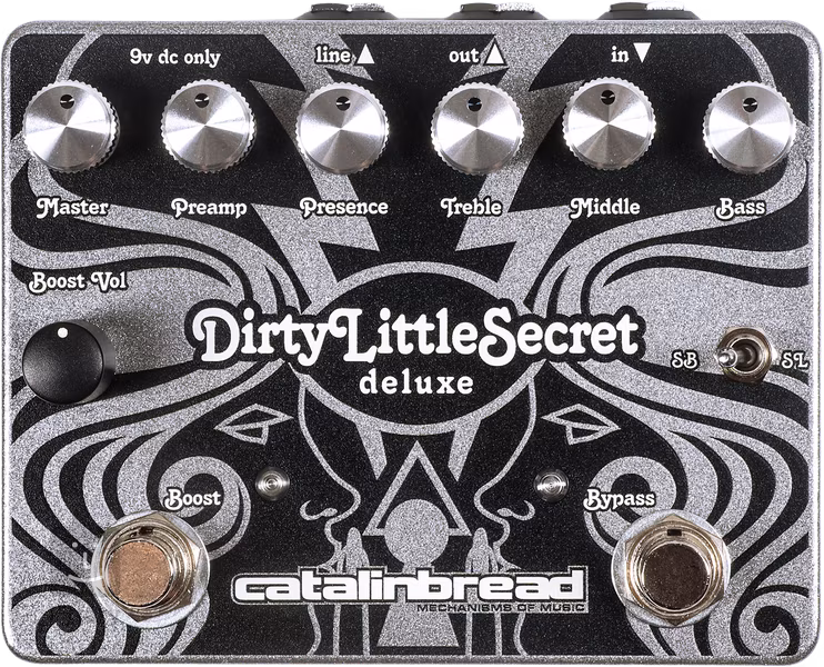 Der Dirty Little Secret Deluxe Pedal-Effekt der amerikanischen Marke Catalinbread stellt die nächste logische Evolutionsstufe in der Emulation von Marshall Plexi-Maschinen dar. Er verfügt über eine verbesserte Original-DLS-Schaltung mit Phaseninverter, Endstufensimulation, Ausgangstransformator, Super Lead- und Super Bass-Modus-Schalter, externem Presence-Tiefpassfilter-Regler, internem Tightness-Hochpassfilter-Regler und +10dB Line-Ausgang. Ganz einfach: Wenn Sie den Marshall Plexi-Sound in Form eines Pedal-Effekts suchen, dann können Sie mit dem Dirty Little Secret Deluxe-Effekt nichts falsch machen.