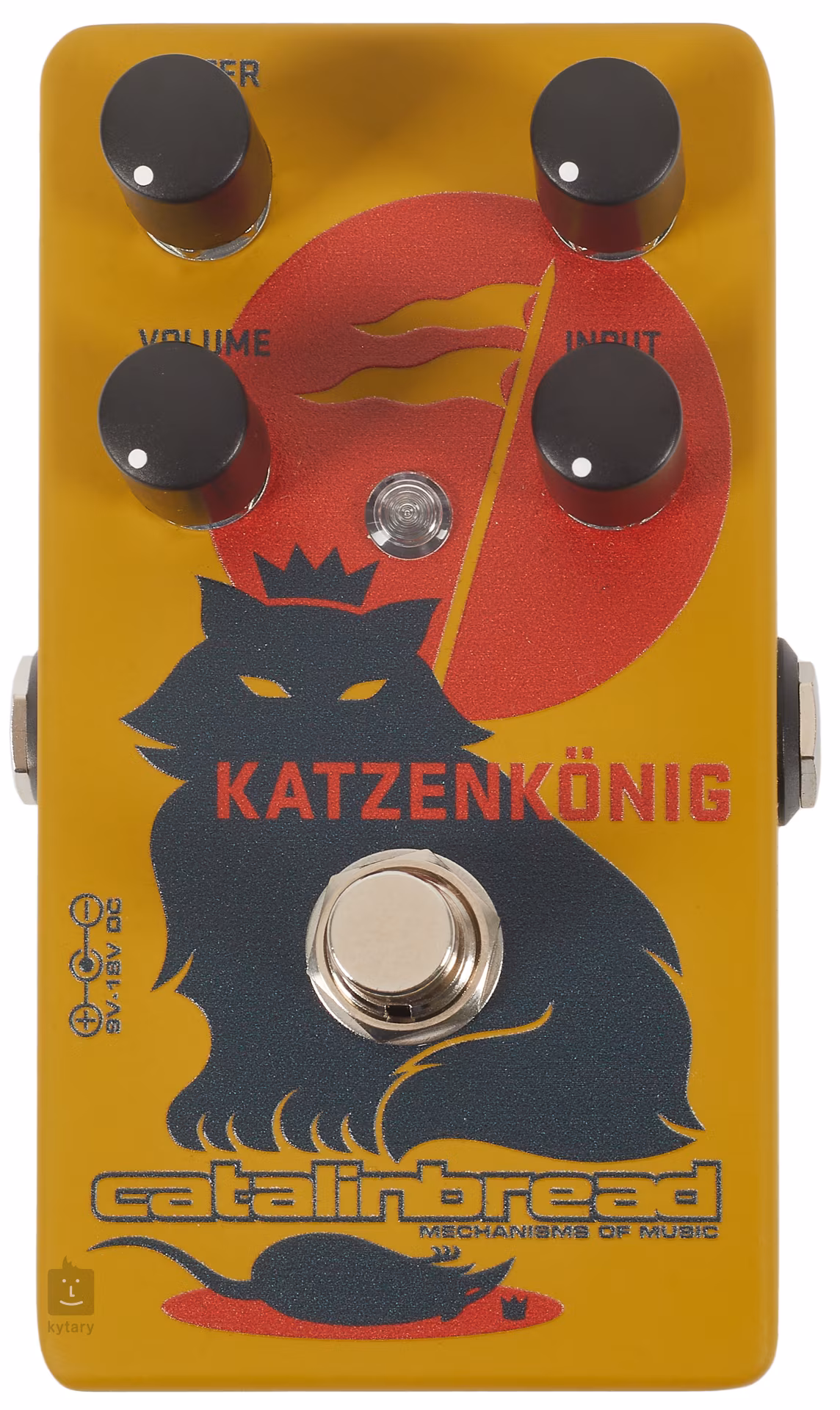 Die gesamte Elektronik des Pedals ist in einem soliden Metallgehäuse untergebracht. Der Catalinbread KATZENKÖNIG ist als True-Bypass verdrahtet. Zur Stromversorgung wird ein 9-18V-Adapter oder eine 9V-Batterie benötigt.