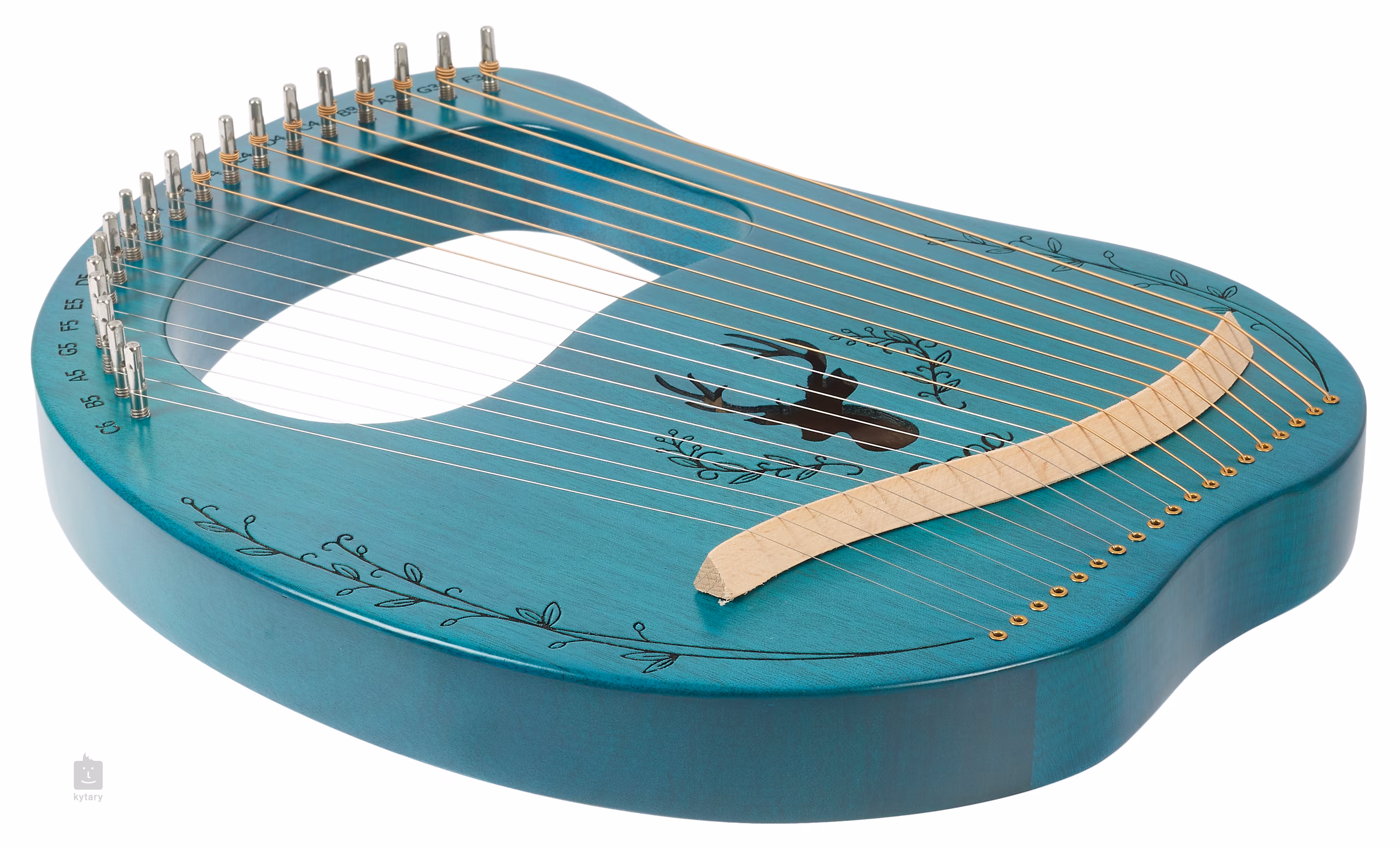 Die Lyra LH19B ist blau, hat sechzehn Saiten und ist mit einer Schnitzerei um das Schallloch in Form eines Hirsches verziert.