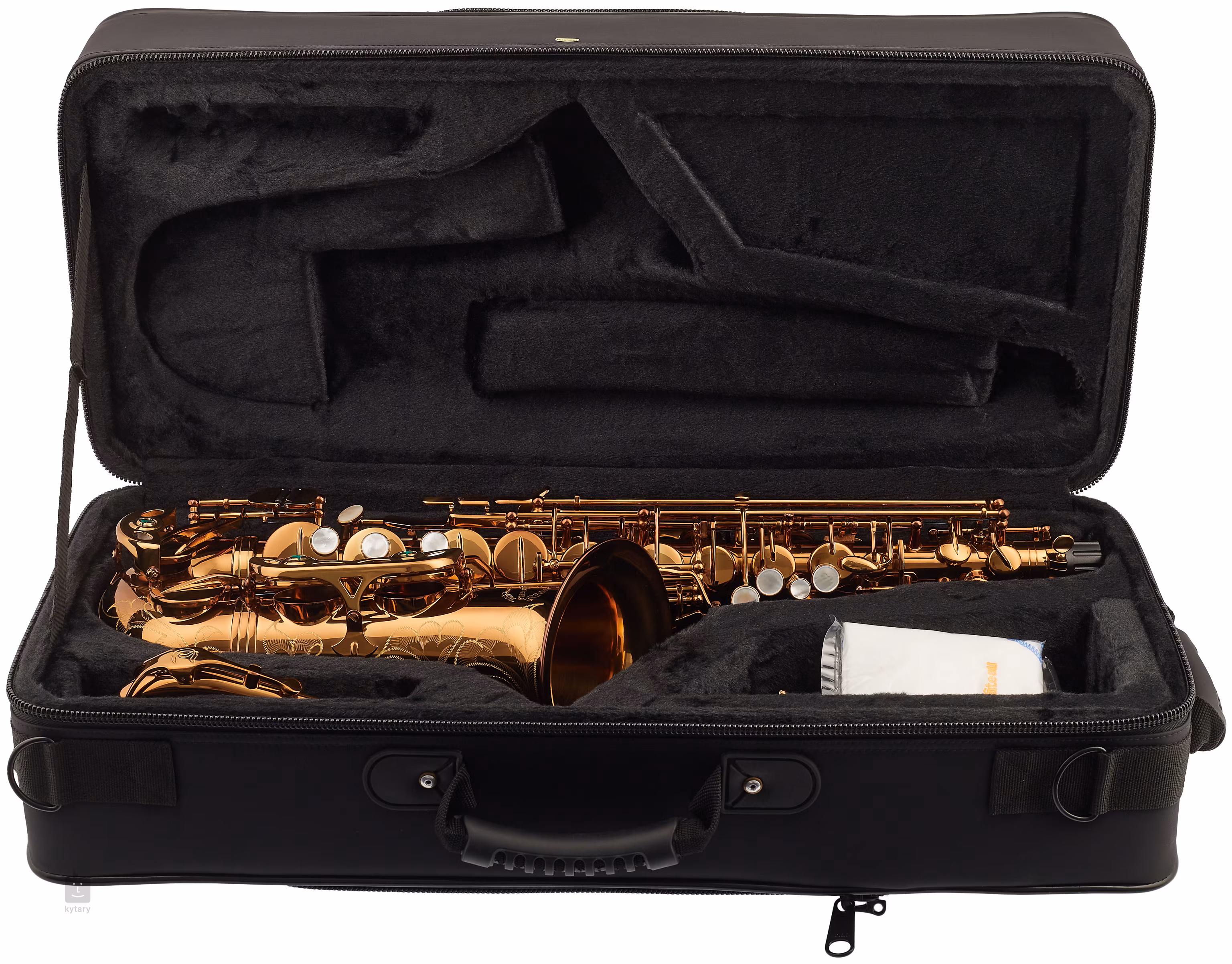 Das Chateau CAS-50C aus der Chambord 50-Serie ist ein erschwingliches Altsaxophon mit einem großen Korpus, der das Volumen und die Resonanz des Instruments verbessert, einem Messingkorpus, einer "Rippen"-Konstruktion, bei der die Mechanik erst an die Messingplatte (Rippe) und dann an den Korpus gelötet wird, einer hohen Fis-Klappe, doppelten Korpusklappenaufhängungen, Perlmuttintarsien und dekorativen Gravuren auf dem Korpus des Instruments. Das Saxophon wird in einem Koffer mit Zubehör geliefert.