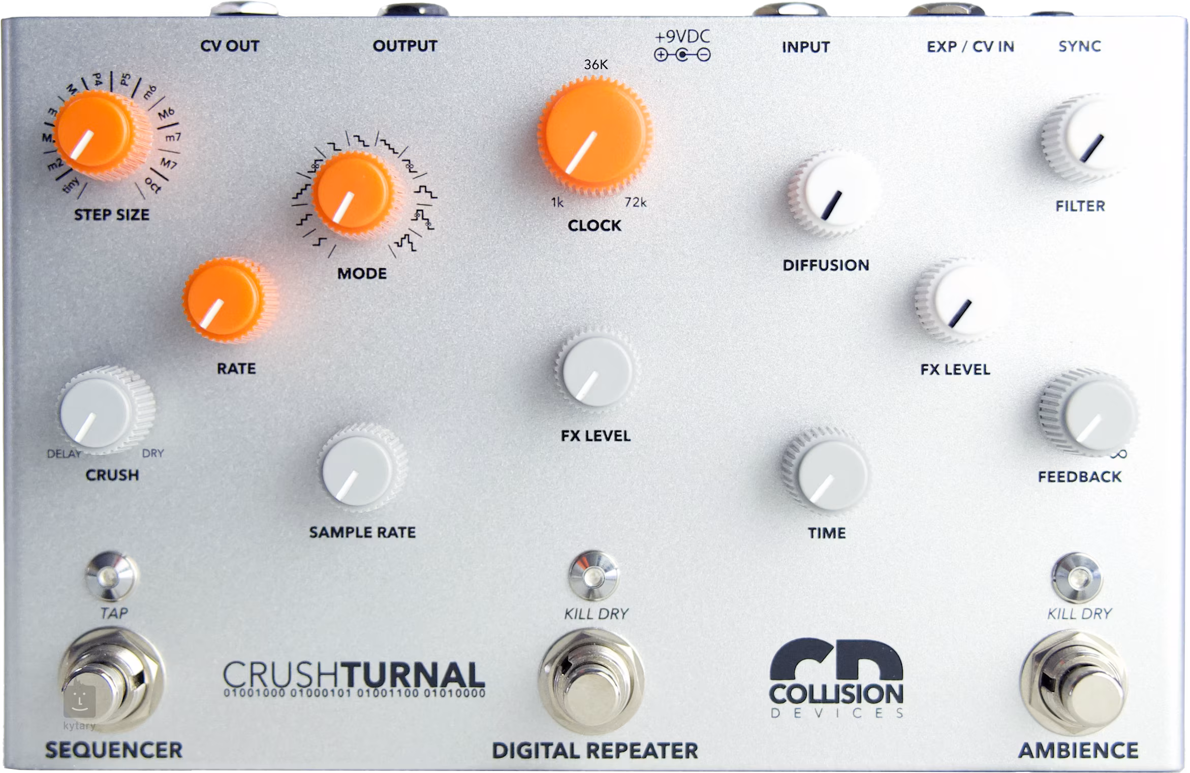Collision Devices Crushturnal ist ein digitales Delay, Reverb, Sample-Reducer und Clock Sequencer, der die Art und Weise verändern wird, wie Sie über Klang und klangliche Möglichkeiten denken. Diese Box nimmt einfach Ihr Signal, verschönert es mit einem Delay-Effekt und Reverb, um es zu loopen, die Stimmung zu ändern, es zu harmonisieren und es schließlich in purem Lärm zu zerschmettern - und das alles auf kreative Art und Weise dank des Clock-Sequenzers und der Fähigkeit, sich mit dem Tap-Tempo und einem externen Signal zu synchronisieren. Dabei liegt der Schlüssel zu den Reglern immer noch in Ihren Händen, und es spielt keine Rolle, ob Sie Crushturnal mit Synthesizern, E-Gitarren oder anderen elektrischen und elektronischen Instrumenten und Geräten verwenden.