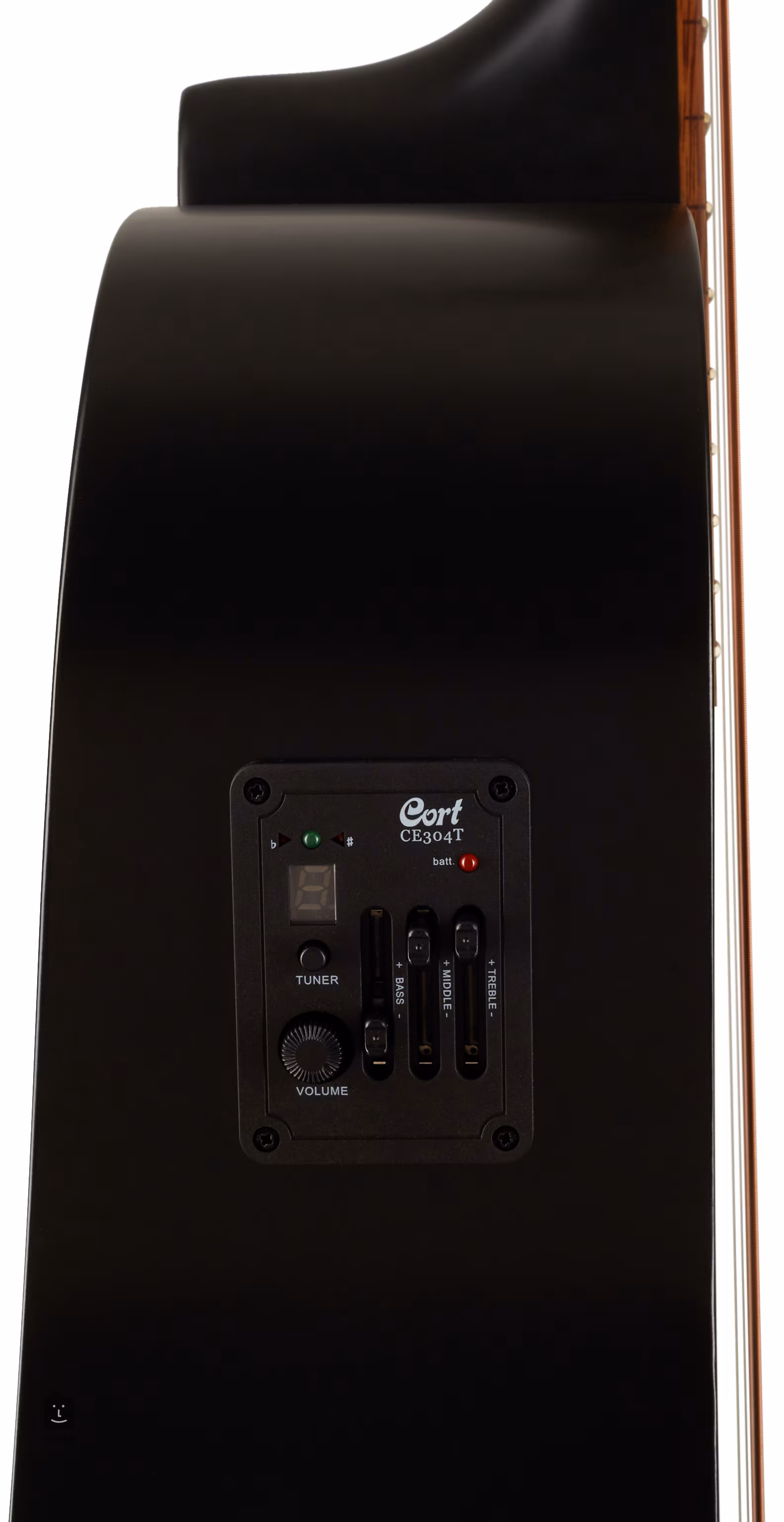 Die Cort AD 810E ist eine elektroakustische Gitarre vom Typ Dreadnought. Der mehrschichtige Korpus des Instruments besteht aus Fichtenholz an der Vorderseite und Mahagoni an Boden und Zargen. Diese bewährte Holzkombination verleiht dem Instrument einen ausgewogenen Klang mit dem nötigen Maß an klanglicher Klarheit und Wärme. Auf den Mahagoni-Hals ist ein Griffbrett aus exotischem Merbau-Holz geklebt, das mit zwanzig Bünden ausgestattet ist und mit Positionierungspunkten versehen ist, um die Navigation auf der Oberfläche zu erleichtern.