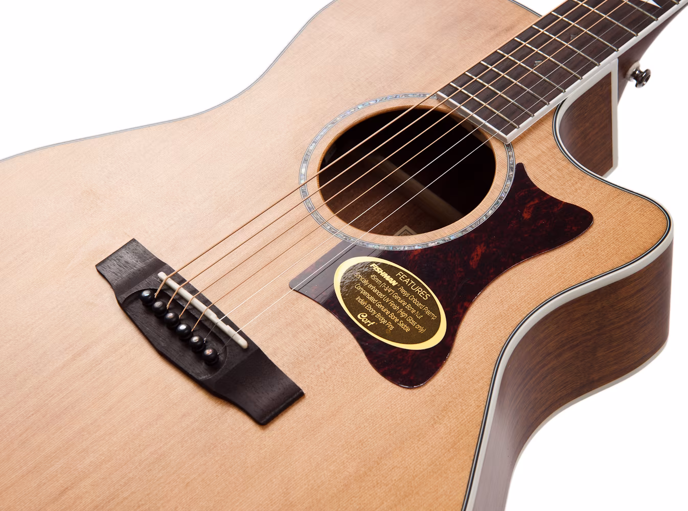 Die Vorderseite dieser Gitarre ist aus massivem rotem Zedernholz gefertigt, während Boden und Zargen aus australischem Blackwood gefertigt sind. Der Mahagoni-Hals ist auf ein Ovangkol-Griffbrett mit zwanzig Bünden geleimt, und Positionspunkte sowie eine verzierte Einlage am zwölften Bund erleichtern die Orientierung auf der Oberfläche. Der untere Ausschnitt des Korpus (venezianisch) bietet eine gute Führung auch in höheren Lagen des Griffbretts. Die natürliche akustische Resonanz des Holzes wird durch die reduzierte X-Verzahnung (Advanced Scalloped X) und eine dünne UV-Lackschicht verstärkt.