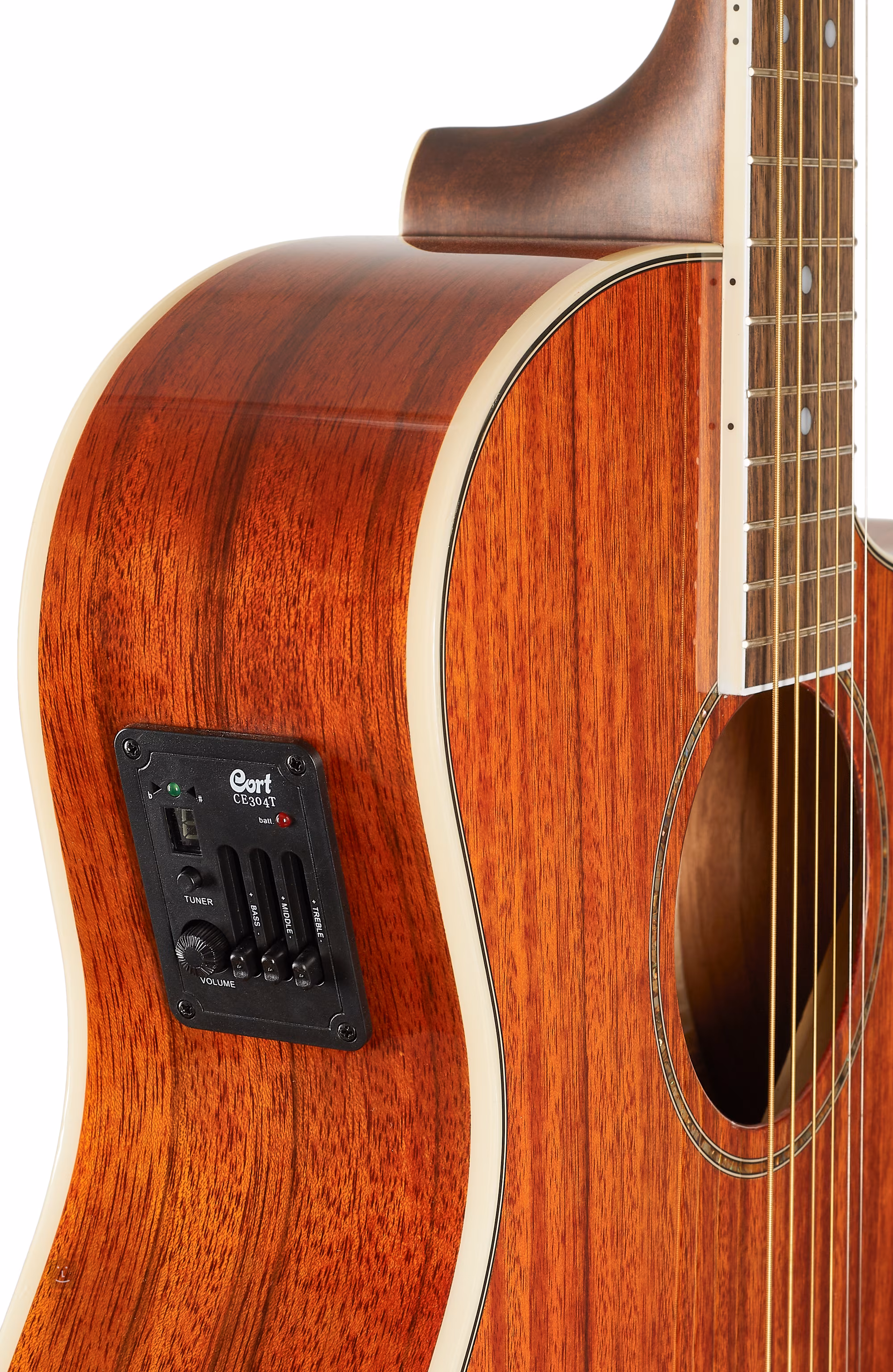 Für die Tonabnahme sorgt der Cort CE306T Vorverstärker mit Dreiband-EQ, Lautstärkeregler und eingebautem Stimmgerät. Die Saiten sind in den Druckguss-Laufwerken und dem Feigenholz-Griffbrett der Firma montiert. Die schöne Verarbeitung wird durch die imitierte Perlmutt-Rosette und das doppelseitige Body-Binding unterstrichen.