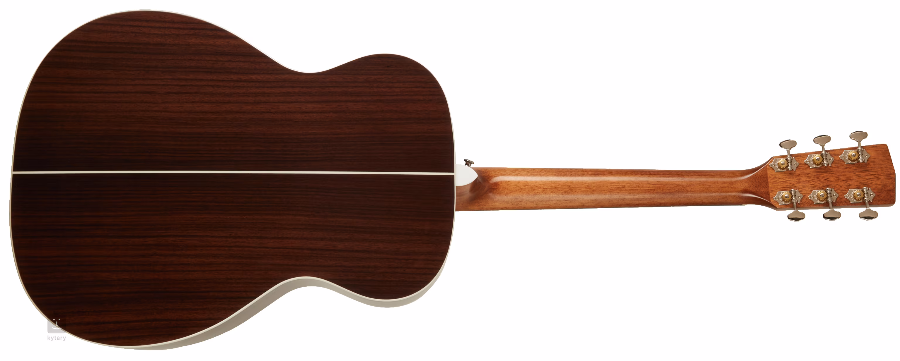 Die Decke der Gitarre besteht aus massivem Sitka-Fichtenholz, das vor dem Zusammenbau einer speziellen Wärmebehandlung unterzogen wurde (ein Verfahren namens ATV - Aged to Vintage). Das Ergebnis ist der Klang und das Aussehen von jahrzehntelang gealtertem Holz, obwohl es sich um ein brandneues Modell handelt. Der Boden und die Zargen sind aus aufgearbeitetem Palisanderholz. Diese Kombination von Hölzern verleiht dem Instrument einen ausgewogenen Klang mit dem nötigen Maß an tonaler Klarheit und Wärme.