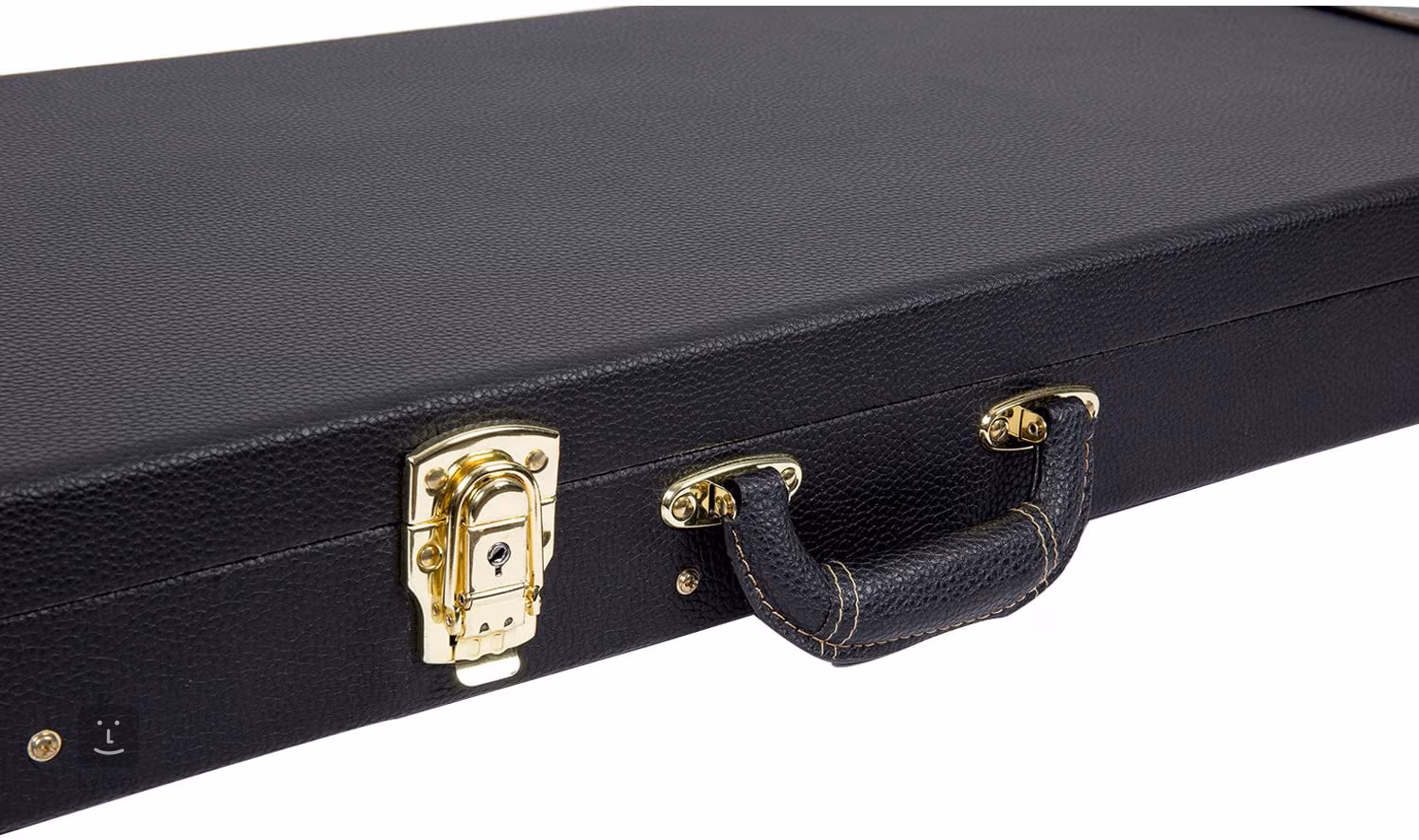 Das Innere des Koffers ist mit weichem Plüsch gefüttert und reichlich gepolstert, so dass der Bass perfekt vor Stößen und Kratzern geschützt ist. Ein großes Innenfach dient zur Aufbewahrung von Zubehör, in dem Stimmgerät, Saiten, Kapodaster und andere wichtige Utensilien sicher verstaut werden können. Ein weicher, lederbezogener Griff, der gut in der Hand liegt, erleichtert den Transport. Das luxuriöse Design des Koffers wird durch elegante Goldbeschläge akzentuiert und macht ihn nicht nur praktisch, sondern auch zu einem ästhetischen Accessoire für den sicheren Transport Ihres Basses.