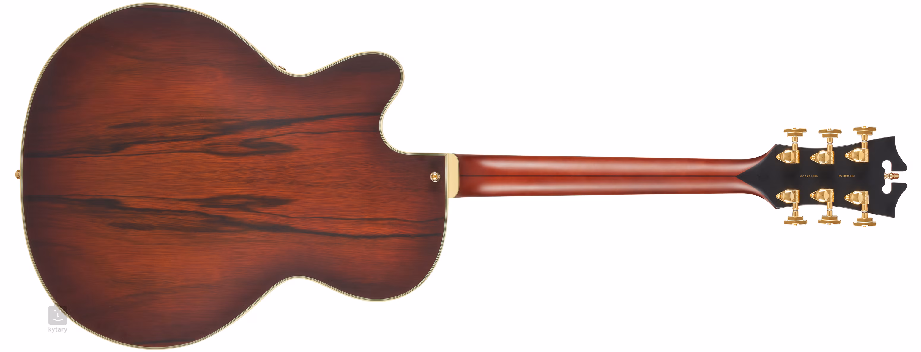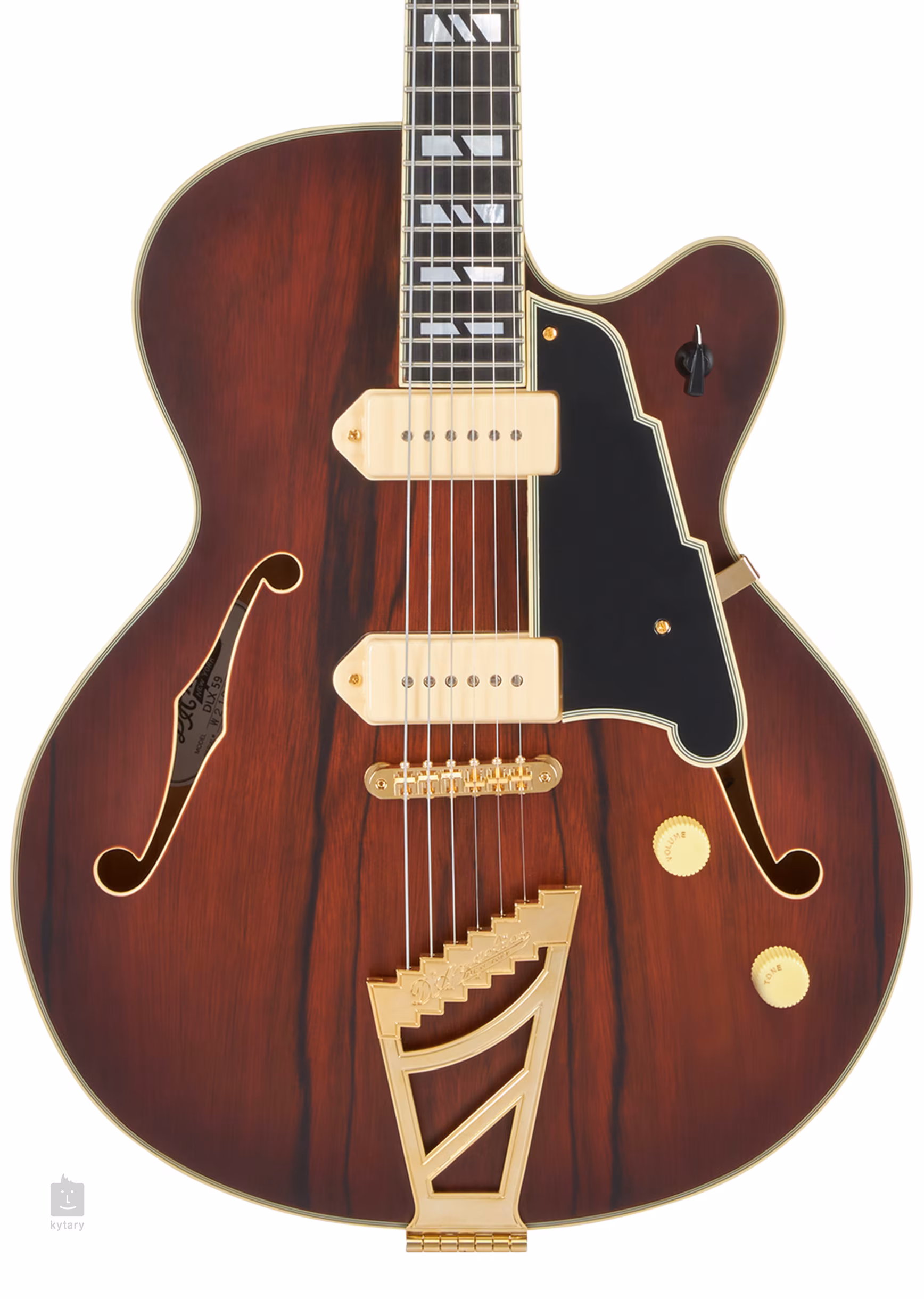 Der Korpus der Gitarre wird durch die für das Unternehmen typische Art-Déco-Kopfplatte mit Perlmutteinlage und Firmenlogo ausgeglichen. Stabile Stimmung und gutes Sustain werden durch die Befestigung der Saiten durch den Knochen-Nullbund in Grover 509 Super Rotomatic Locking Mechaniken und durch das TOM-Saitenbrett im Saiten- und Art Deco-Stil garantiert. Die luxuriöse Verarbeitung der Gitarre wird durch eine satinierte, halbtransparente Lackierung, mehrlagiges Korpus-, Griffbrett- und Kopfplatten-Binding, ein fünflagiges Scalini-Schlagbrett, goldene Hardware und Vintage-Akzente in Form von Cupcake-Potentiometerkappen oder Pickup-Schaltern im Chickenhead-Design unterstrichen.