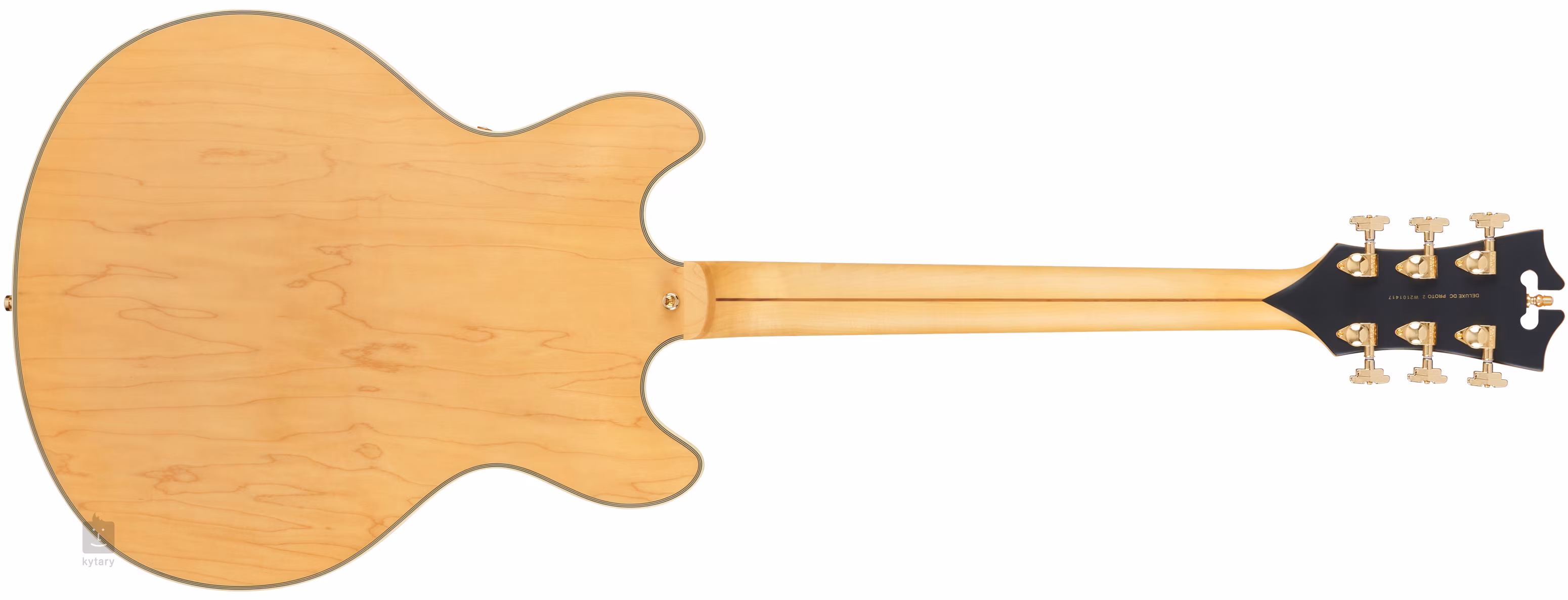 Die D'Angelico Deluxe DC Satin Honey ist eine Semi-Hollowbody-Gitarre im Double-Cut-Design. Ihr 16 Zoll breiter Korpus ist aus laminiertem Ahorn gefertigt. Ein leichter Mittelblock versteift den Resonanzboden und wirkt dem unerwünschten "Binding"-Effekt des Balgs entgegen.