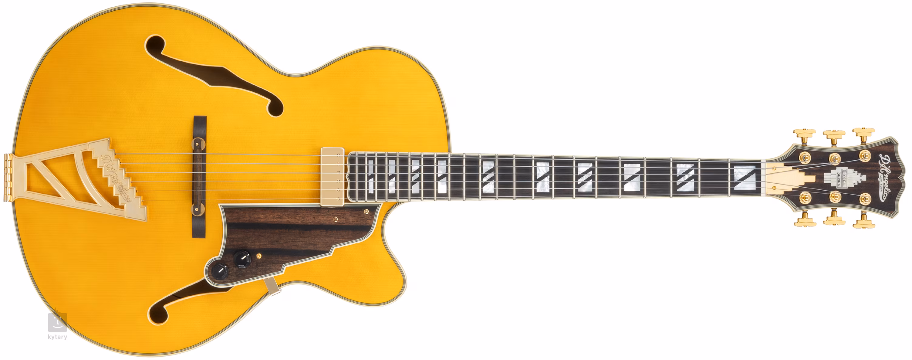 Die D'Angelico Excel 16 Amber ist eine sechzehn Zoll breite Lube-Gitarre mit unverwechselbarem D'Angelico-Design und einem warmen Sound, der direkt aus dem klassischen New Yorker Jazz atmet. Sie ist eine kompaktere Alternative zur meistverkauften EXL-1 des Unternehmens.