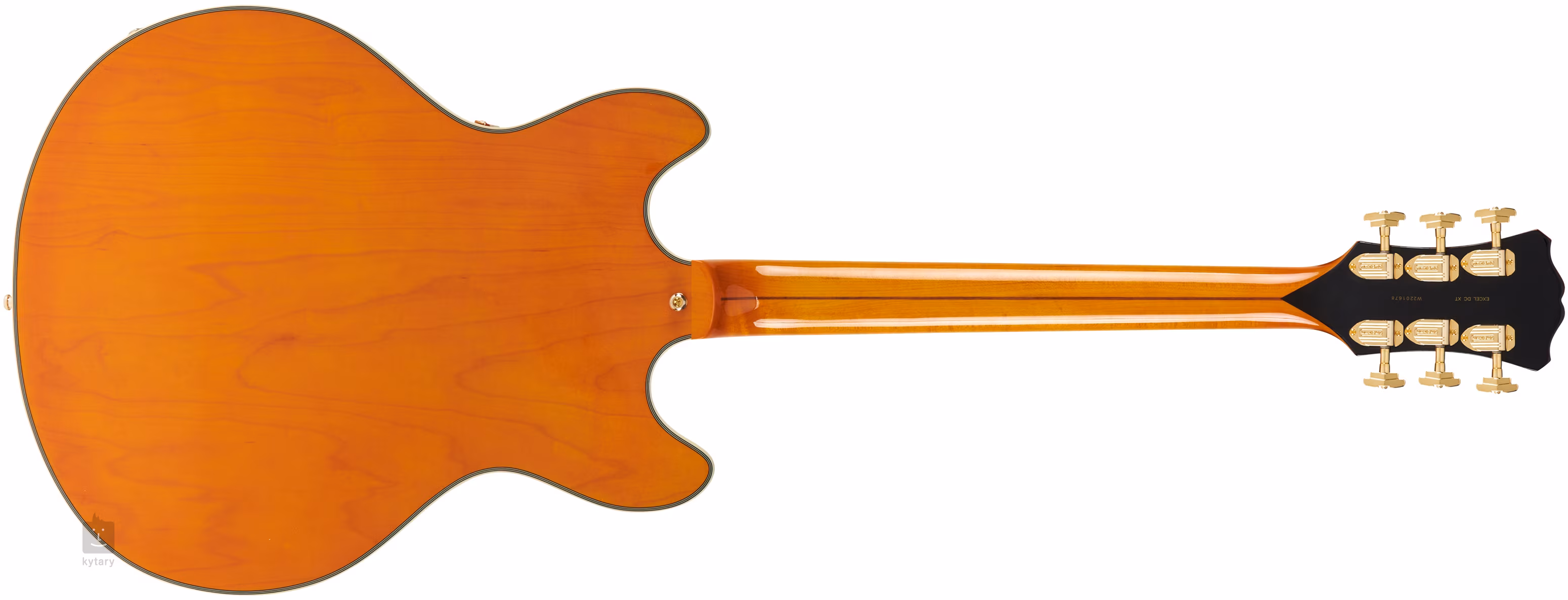 Stabile Stimmung und gutes Sustain werden durch die Befestigung der Saiten über den Graphtech TusQ-Nullbund im Grover 150 Imperial-Mechanismus mit einem Übersetzungsverhältnis von 16:1 und über den TOM cob im Halsstab gewährleistet. Das luxuriöse Finish der Gitarre wird durch das mehrschichtige Korpus-, Griffbrett- und Kopfplatten-Binding, das fünflagige Scalini-Schlagbrett, die Ebenholz-Potentiometerkappen, die goldfarbene Hardware und eine Kopfplatte im Vintage-Design der 1930er Jahre von D'Angelico (Throwback Scroll-Style) mit einem D'Angelico New York-Logo aus Perlmutt und einer Excel-Series-Einlage aus Perlmutt akzentuiert.