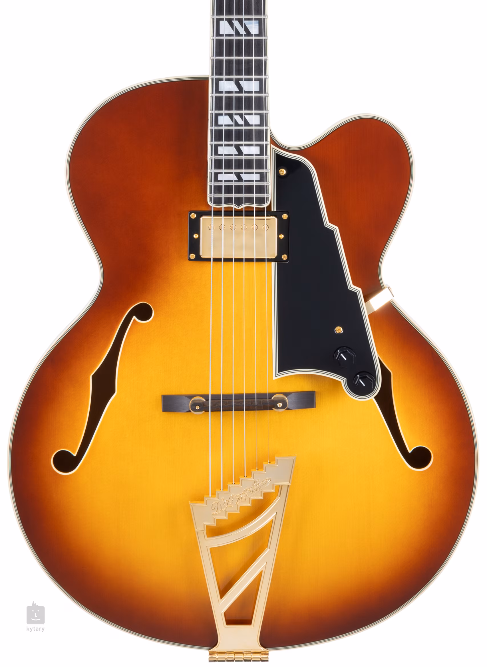 Der Korpus der Gitarre wird durch die charakteristische Kopfplatte des Unternehmens mit Perlmutt- und Excel Shield-Logo ausgeglichen. Stabile Stimmung und gutes Sustain werden durch die Befestigung der Saiten durch den Graphtech NuBone XL Nullbund in Grover 150 Imperial Gears mit einem Übersetzungsverhältnis von 16:1 und durch das Ebenholz-Griffbrett im Halsstab (D'Angelico Stairstep) garantiert. Der stilvolle Look der Gitarre wird durch das Korpus-, Griffbrett- und Kopfplatten-Binding, goldene Hardware und ein fünflagiges Scalini-Schlagbrett unterstrichen.