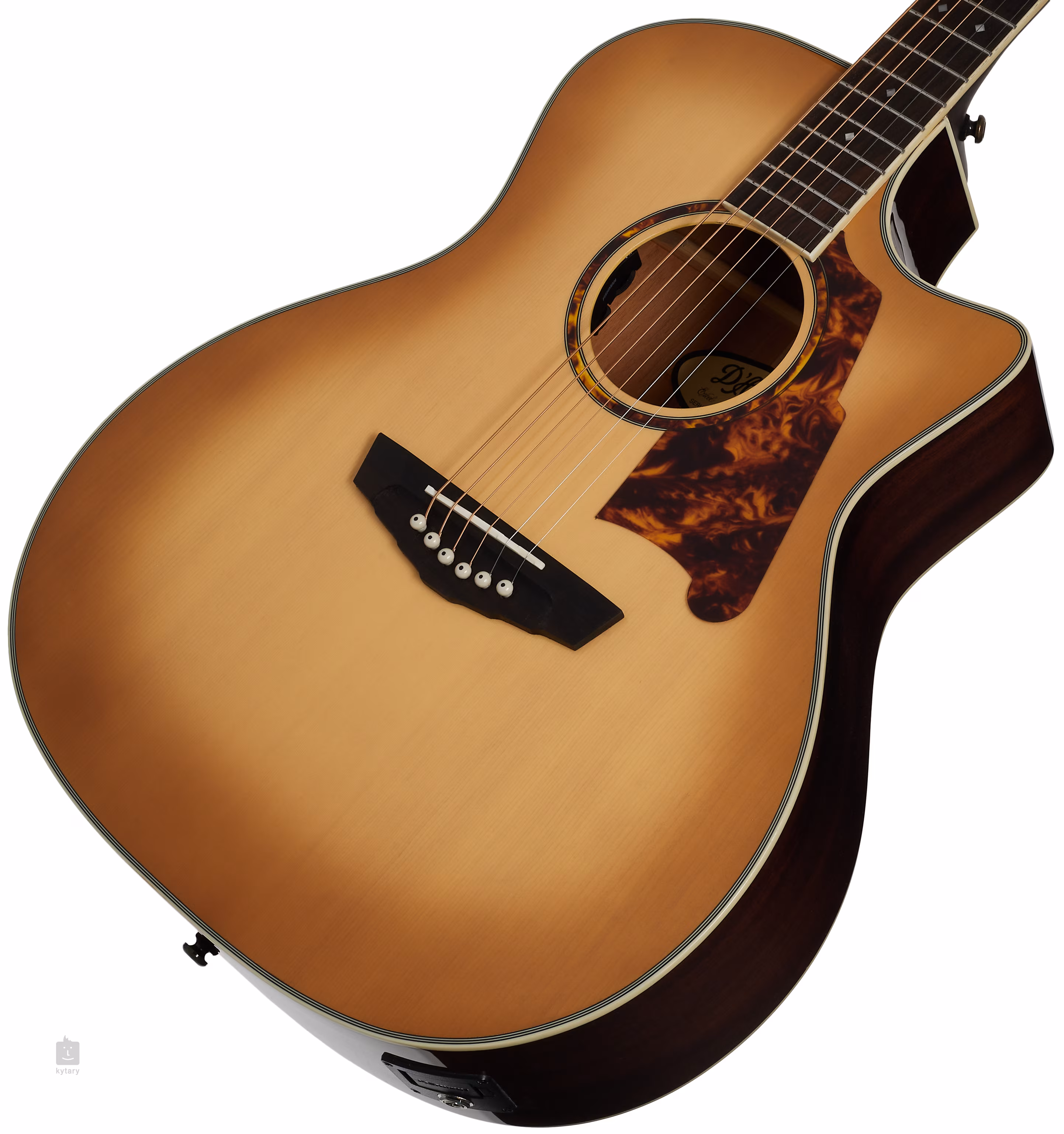 Die Vorderseite der Gitarre ist aus massiver Fichte gefertigt, während Boden und Zargen aus massivem Mahagoni hergestellt sind. Der Mahagoni-Hals mit komfortablem Slim "C"-Profil und satiniertem Finish ist mit einem Palisander-Griffbrett mit 20 Medium-Jumbo-Bünden ausgestattet. Die Orientierung auf dem Griffbrett wird durch Perlmutt-Positionsmarkierungen in Form kleiner Diamanten erleichtert, während der untere Korpusausschnitt auch in höheren Griffbrettpositionen einen bequemen Sitz ermöglicht.