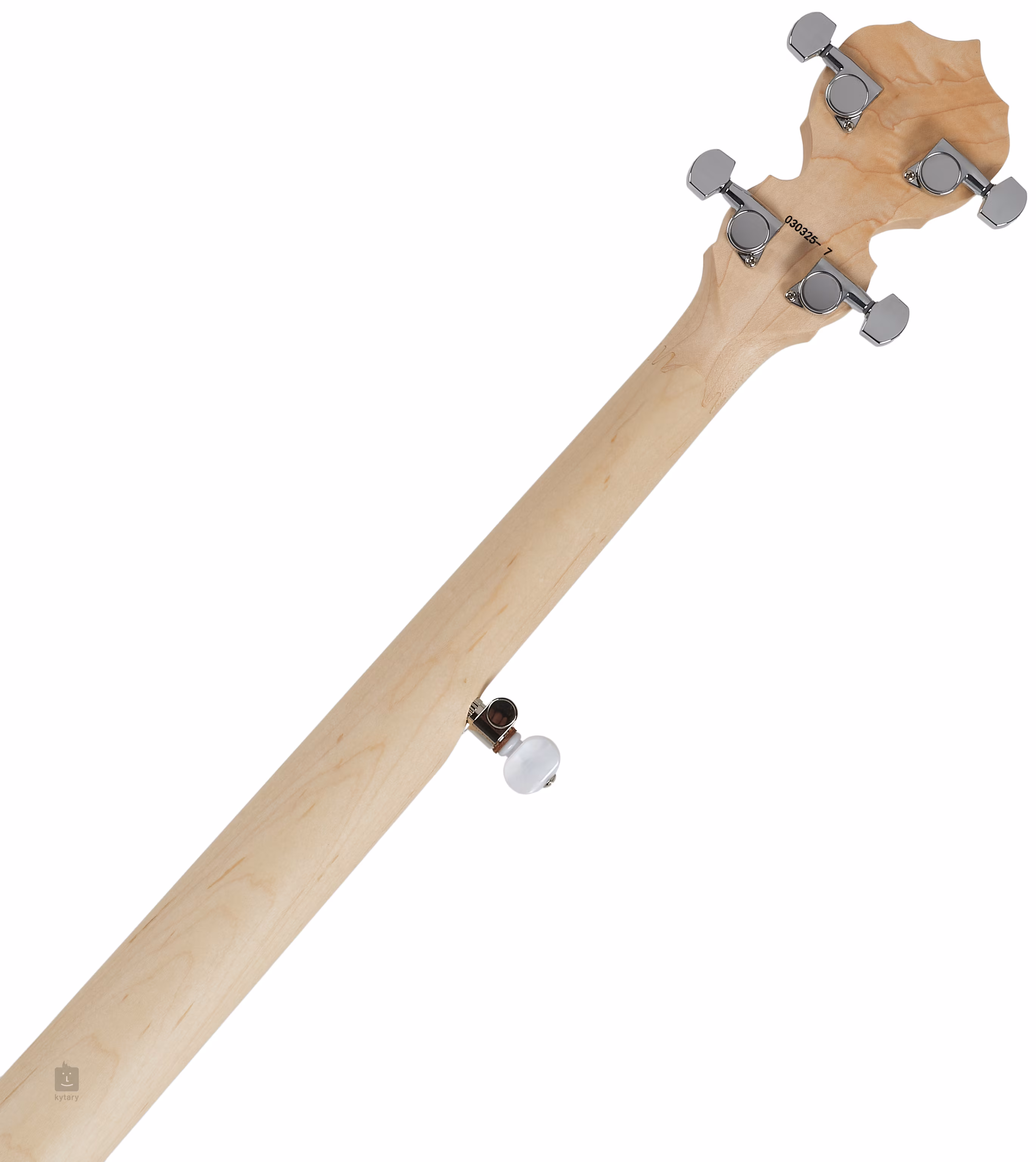 Das fünfsaitige elektroakustische Goodtime-Banjo gehört zu den sogenannten Open-Back-Instrumenten, d.h. einem Banjo ohne Resonanzkörper mit offener Bodenplatte. Sein Klang kann in einer Vielzahl von Stilrichtungen von Bluegrass, Folk bis Jazz eingesetzt werden. Das Ahorn-Griffbrett des Instruments ist mit zweiundzwanzig Pakfong-Bünden ausgestattet, und die Orientierung auf dem Griffbrett wird durch hölzerne Positionsmarkierungen erleichtert, die vom Art-déco-Stil inspiriert sind. Ein Elf-Zoll-Balg ist mit einem Stahlrand am Ahornkorpus befestigt. Die Saiten sind in hochwertigen geschlossenen gitarrenartigen Mechaniken (einschließlich eines fünften Stifts) und über ein Ahorn-/Ebenholz-Griffbrett in einem vernickelten Stahlsaitenhalter befestigt.