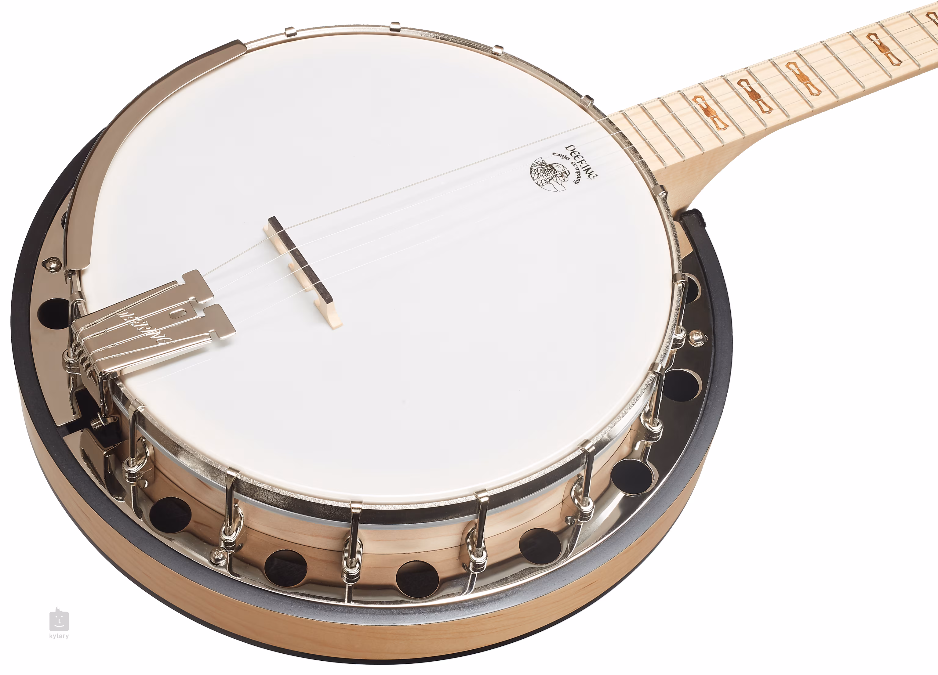 Das Goodtime Two Plectrum Modell ist ein viersaitiges Banjo, das speziell für das Plektrumspiel geeignet ist. Es ist meist in C,G,B,D gestimmt und sein Klang ist am häufigsten im Jazz oder Folk zu finden. Es ist ein Resonator-Banjo, d. h. ein Banjo mit einer gewölbten Abdeckung auf dem Boden aus einer Schicht Ahorn und zwei Schichten Pappel, die dem Instrument einen klaren Ton mit deutlich besserer Klangprojektion verleiht als ein Banjo mit offenem Boden. Das Ahorn-Griffbrett des Instruments ist mit zweiundzwanzig Pakfong-Bünden ausgestattet, und Positionsmarkierungen erleichtern die Navigation auf der Oberfläche. Ein elf Zoll langer Balg ist mit einem Stahlrand am Ahornkorpus befestigt. Die Saiten sind auf der einen Seite in hochwertigen geschlossenen (Gitarren-)Mechaniken und auf der anderen Seite über ein Ahorn/Ebenholz-Griffbrett in einem vernickelten Stahlsaitenkasten montiert.
