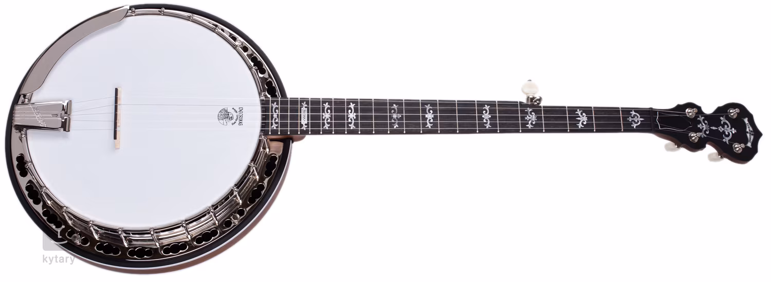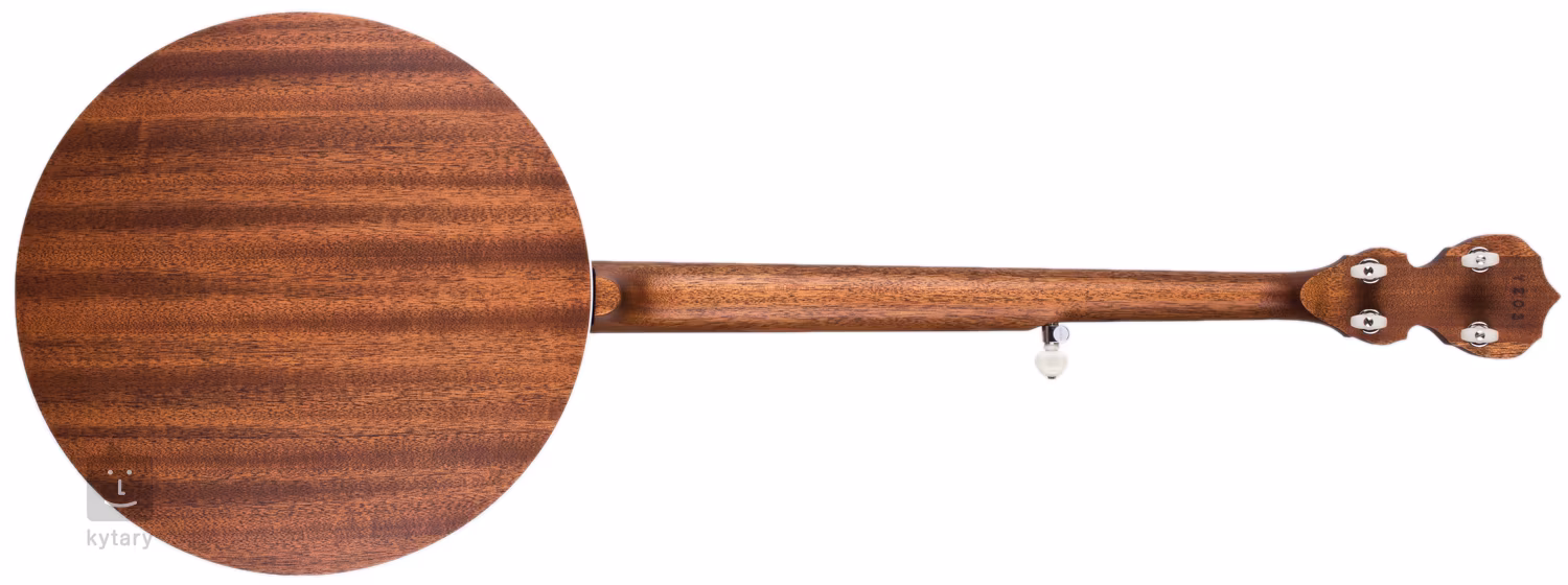 Der Mahagoni-Hals mit Zwei-Wege-Beleistung ist mit einem Ebenholz-Griffbrett mit zweiundzwanzig Pakfong-Bünden ausgestattet. Positionsmarkierungen in Form von Ziergravuren erleichtern die Orientierung auf der Oberfläche. Die Saiten sind auf der einen Seite in Planetary-Qualitätsmechaniken gelagert, auf der anderen Seite über ein Ahorn/Ebenholz-Griffbrett in einem verstellbaren Deering True Tone Halsstab aus vernickeltem Stahl. Die dekorativen Gravuren auf der Kopfplatte, der Schulterstütze und dem einteiligen Zierflansch aus Zink ergänzen die verwendeten Grundmaterialien sowohl praktisch als auch optisch.