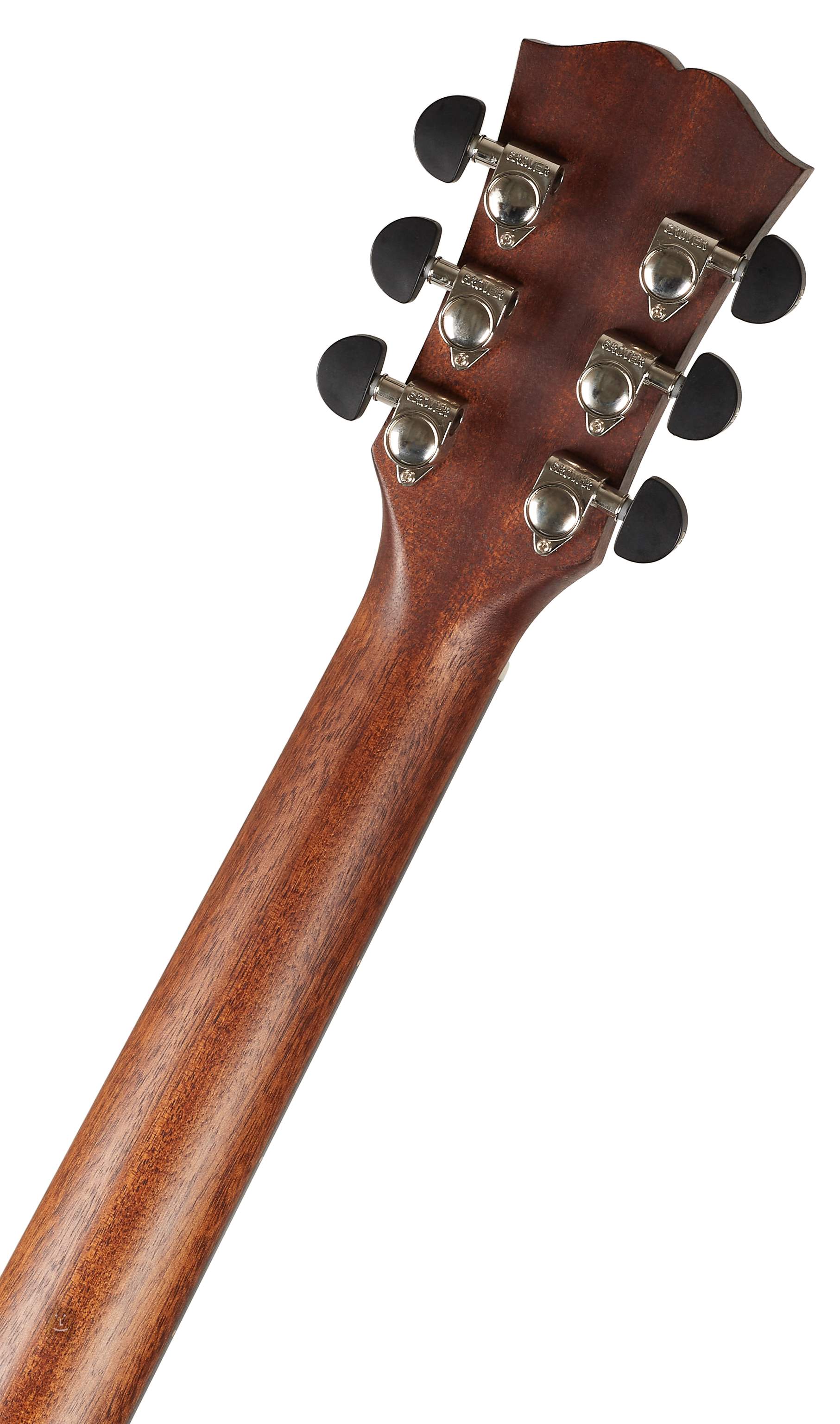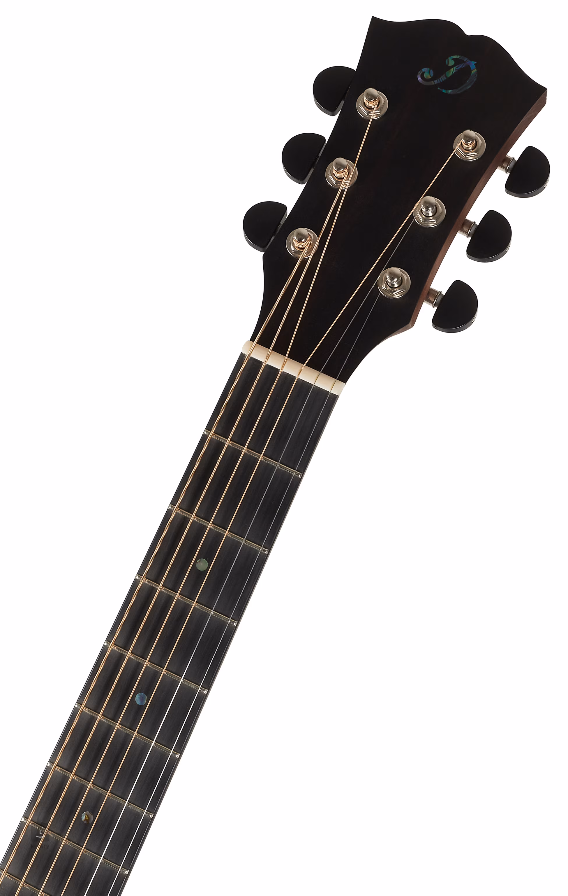 Ein ebonisiertes Hartholz-Griffbrett ist auf den Nato-Hals geleimt, der wegen seiner ähnlichen Eigenschaften als östliches Mahagoni" bezeichnet wird. Die Stimmstabilität wird durch die Befestigung der Saiten über den Knochen-Nullbund in der Grover-Mechanik und das Hartholz-Griffbrett gewährleistet. Die schöne Verarbeitung wird durch das Sunburst-Finish der Decke und Details in Form von Mahagoni-Randeinfassungen, Decken- und Bodenplatte mit Fischgrätenmuster, Zierrosette, Perlmutt-Firmenlogo auf der Kopfplatte (Abalone) und Perlmutt-Punkte auf dem Griffbrett unterstrichen.