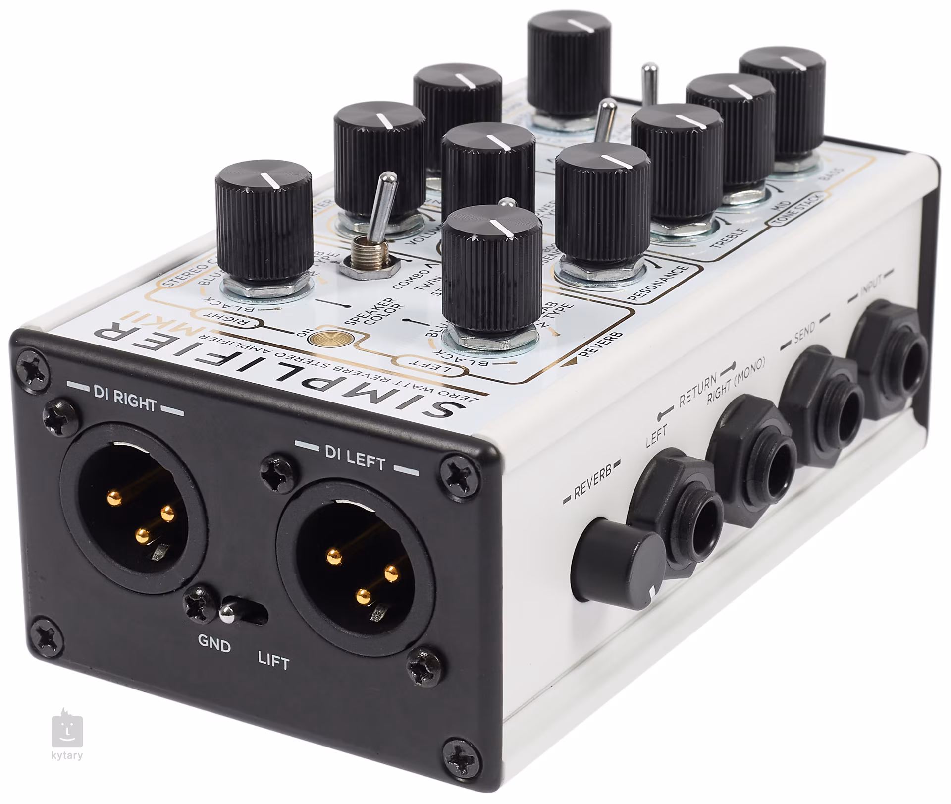 Der DSM Simplifier MKII bietet außerdem einen Aux-Eingang und einen Kopfhörerausgang für ruhiges und entspanntes Abspielen und Üben am späten Abend und in der Nacht, Regler für die Vor- und Endstufensektion, eine Effektschleife, einen Mono-Eingang und einen Stereo-Ausgang (6,3 mm Klinke, XLR DI). Für die Stromversorgung ist ein 9V-Adapter erforderlich (nicht im Lieferumfang enthalten).