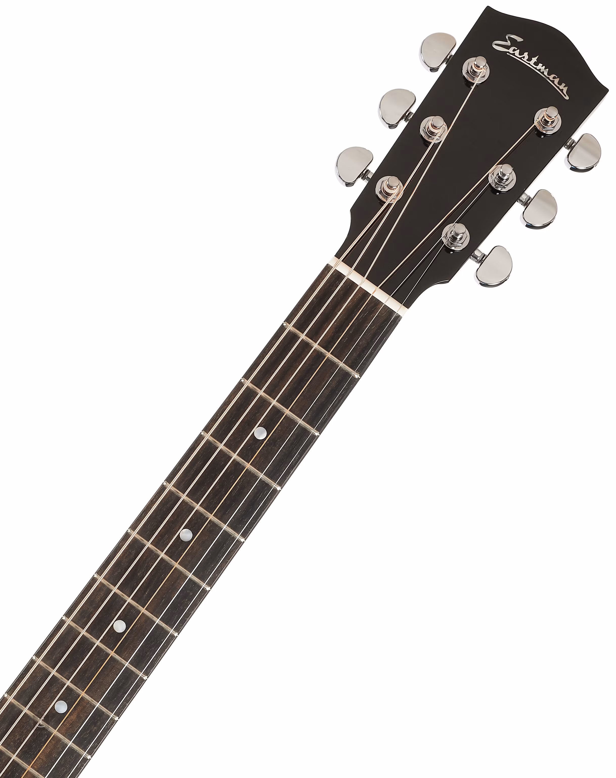 Die Eastman AC222CE-DLX ist eine vollmassive elektroakustische Gitarre im Grand-Auditorium-Stil. Die Vorderseite der Gitarre ist aus Sitka-Fichte gefertigt, während Boden und Zargen aus Ovangkol bestehen. Ein Ebenholz-Griffbrett mit 20 Bünden ist auf einen Mahagoni-Hals mit einem angenehmen "C"-Profil geleimt.