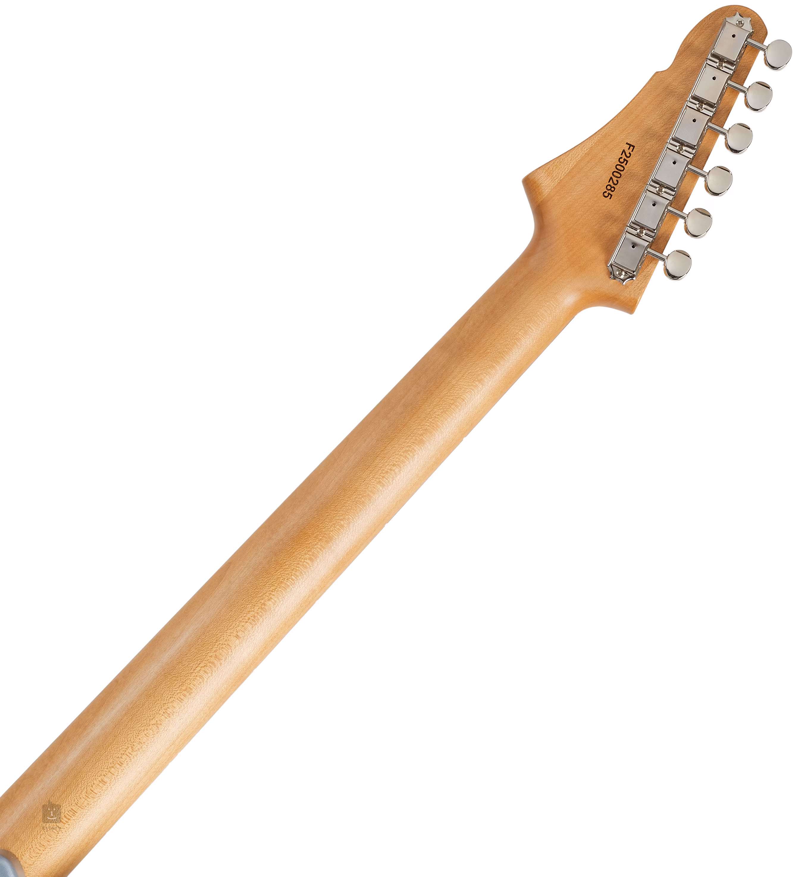 Der Double-Cut-Korpus der FT-DC'62 Ice Blue Metallic ist aus afrikanischem geröstetem schwarzem Limba gefertigt. Das Griffbrett ist mit vierundzwanzig Bünden (Jescar FW47104-P) und Perlmutt-Positionspunkten ausgestattet. Die Wärmebehandlung des Ahornhalses und -griffbretts verleiht dem Holz mehr Stabilität und ein schönes goldenes Aussehen und Gefühl.