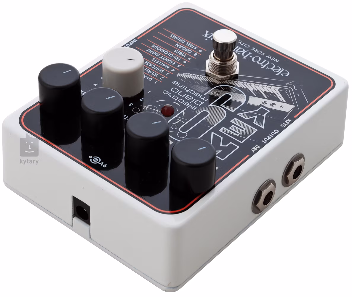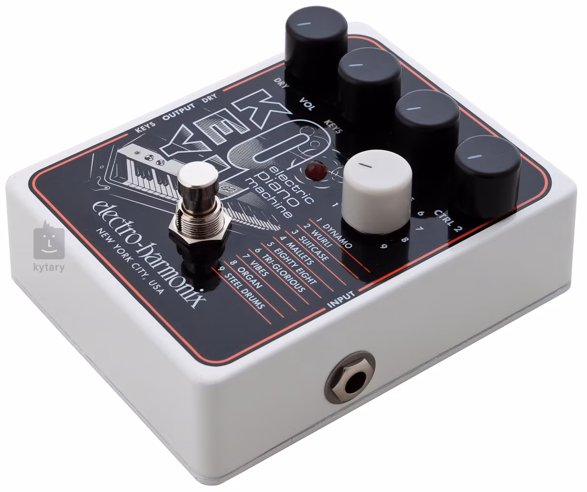 Der KEY9 Electric Piano Machine Pedal-Effekt der amerikanischen Marke Electro Harmonix kann Ihre E-Gitarre in realistisch klingende E-Pianos, Keyboards und Percussion-Instrumente verwandeln. Neun Presets klassischer E-Pianos stehen zur Verfügung - Dynamo (Fender Rhodes), Wurli (Wurlitzer), Suitcase (Rhodes über Phase Shifter angeschlossen), Mallets (Holz-Marimba), Eighty Eight (Rhodes 88 mit eingebautem Tremolo), Tri-Glorious (Dytronics/Dyno My CS-5 Stereo-Chorus-Sound), Vibes (Metall-Vibraphon mit motorisiertem Tremolo), Organ (Orgel), Steel Drums (perkussiver Metall-Drum-Sound).
