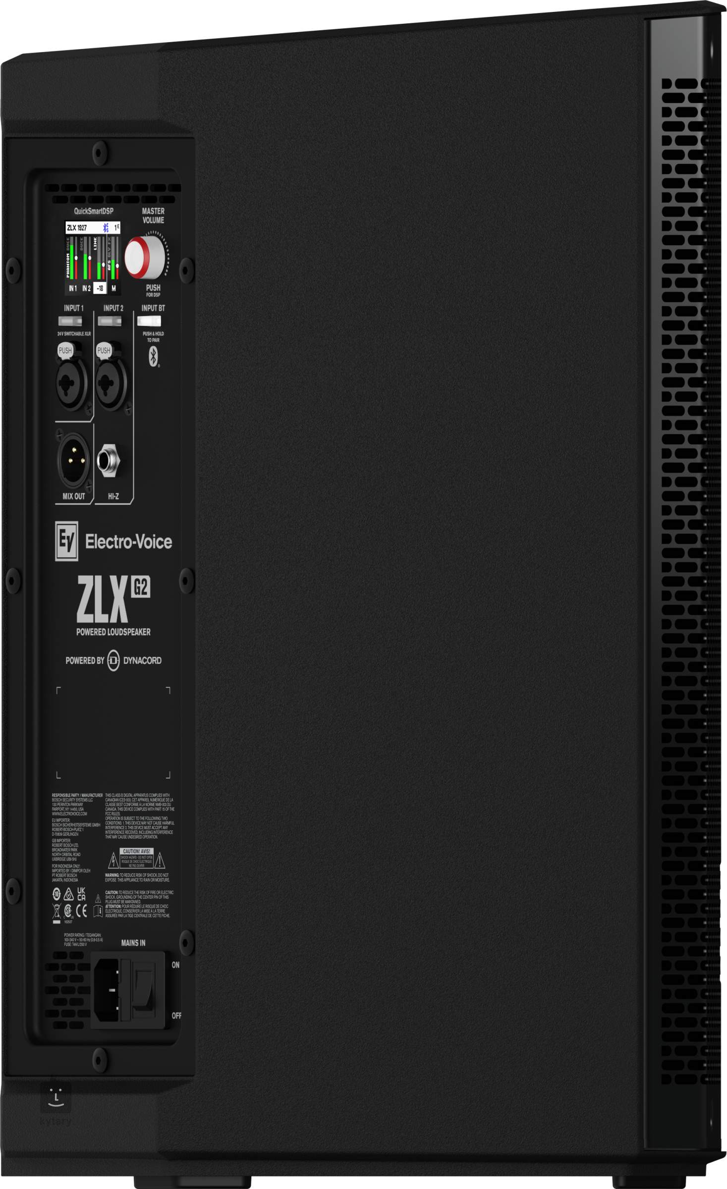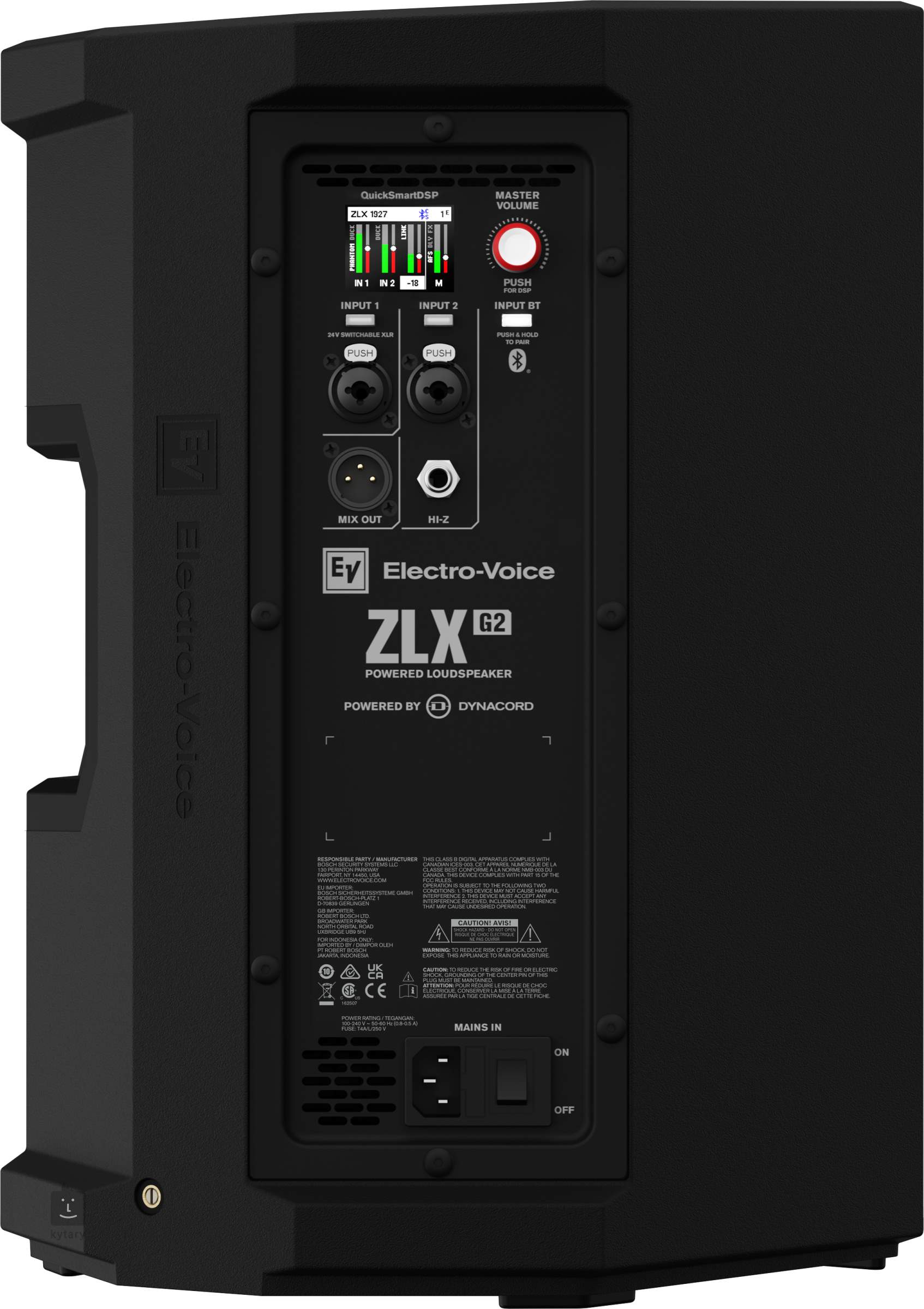 Die ZLX-G2-Lautsprecher sind mit den High-End-Verstärkern von DYNACORD und einer internen DSP-Einheit ausgestattet, die den digitalen Mix, die FX-Einheit, den EQ, den Auto-Feedback-Suppression-Filter (AFS) und die Ducking-Funktion übernimmt. Der Lautsprecher verfügt über zwei Eingangskanäle mit kombinierten XLR/Klinke 6,3 mm TRS-Anschlüssen, einschließlich +24V Phantomspeisung für Kondensatormikrofone und Kompatibilität mit hochohmigen Quellen (Hi-Z).