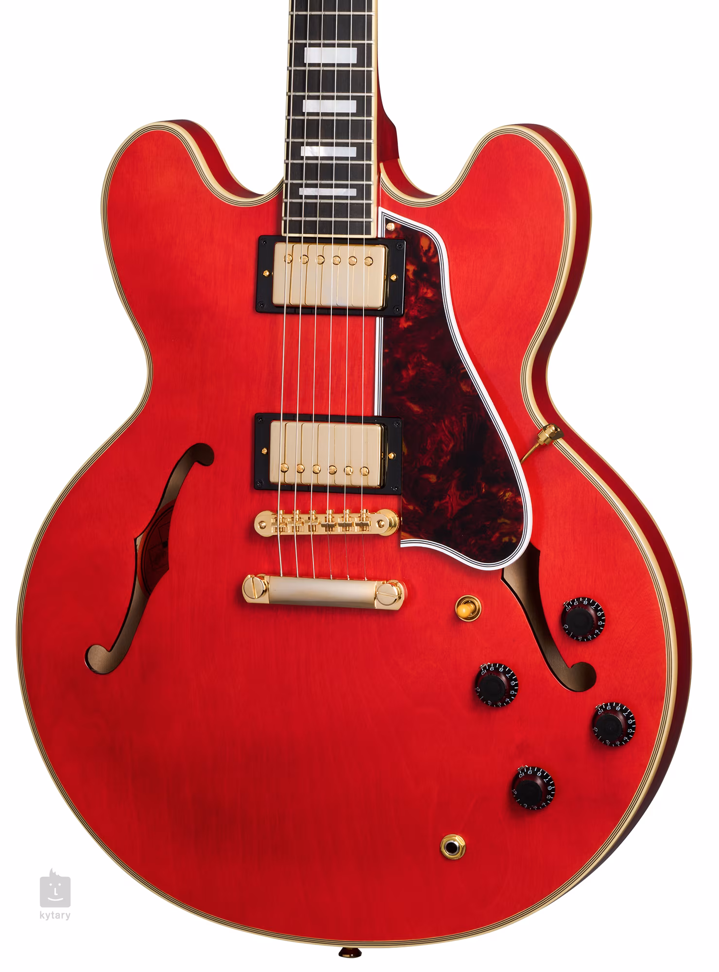 Zwei Gibson Custombucker Humbucker mit Alnico 3-Magneten verleihen der Gitarre den warmen, authentischen Klang der PAF-Pickups der späten 1950er Jahre. Die Tonabnehmer sind mit CTS-Potentiometern, Mallory-Kondensatoren und Ausgangsbuchse handgelötet. Eine stabile Stimmung wird durch die Montage der Saiten durch den Graphtech-Nullbund in der Grover Rotomatic und durch den TOM-Saitenhalter in den Saitenreitern gewährleistet. Das stilvolle Finish wird durch die Einfassung des Korpus, des Griffbretts und der Kopfplatte, das fünflagige Schlagbrett aus Schildpatt-Imitat und die goldene Hardware unterstrichen.