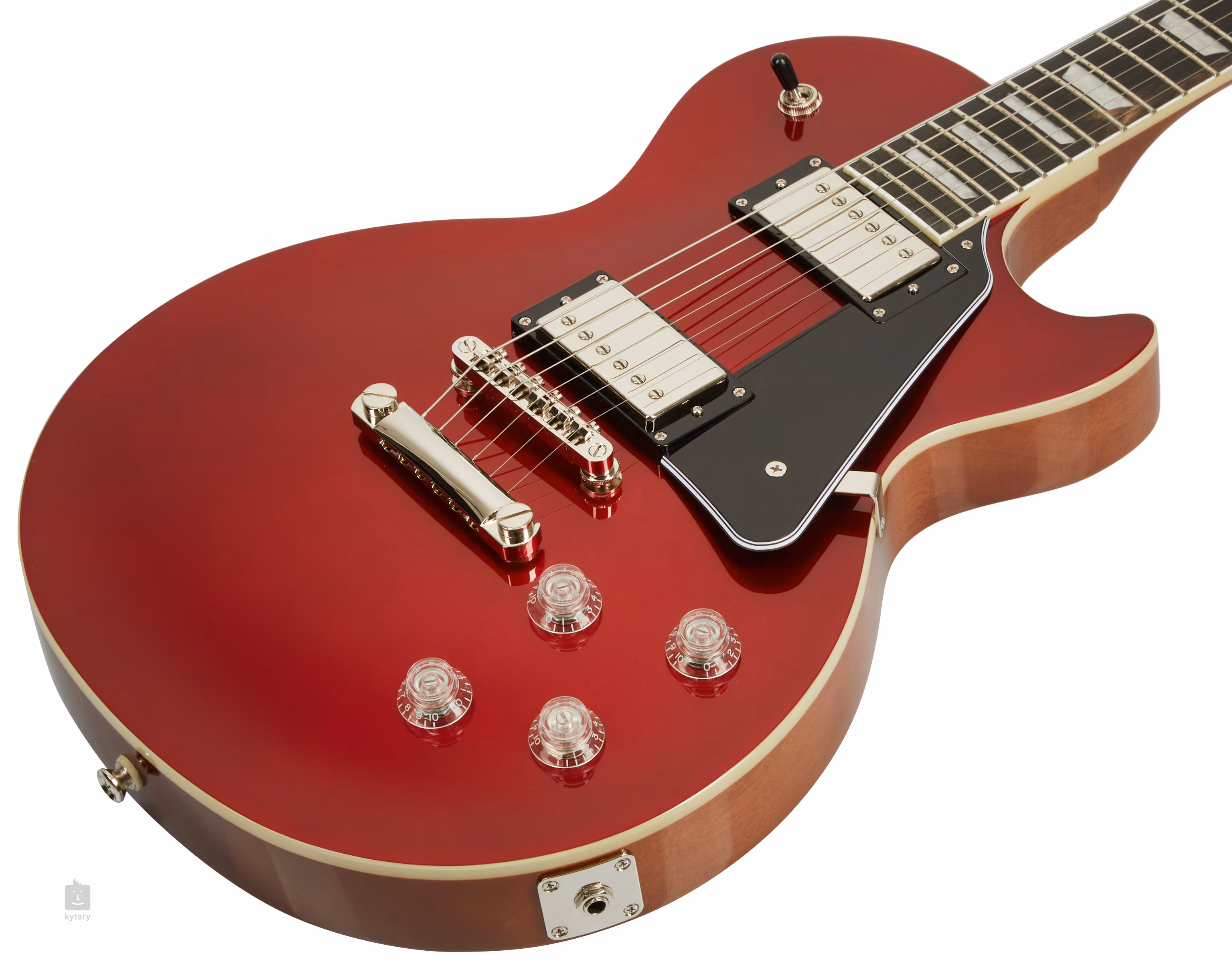 Der leichte Mahagonikorpus der Les Paul Modern Sparkling Burgundy wird durch eine Ahorndecke ergänzt. Ein Mahagoni-Hals mit einem komfortablen asymmetrischen Profil ist mit einem Ebenholz-Griffbrett mit zweiundzwanzig Medium-Jumbo-Bünden verleimt. Der geformte Halsfuß erleichtert das Spielen auch in den höchsten Lagen des Griffbretts, und die Positionsblöcke erleichtern die Orientierung auf der Griffbrettfläche.