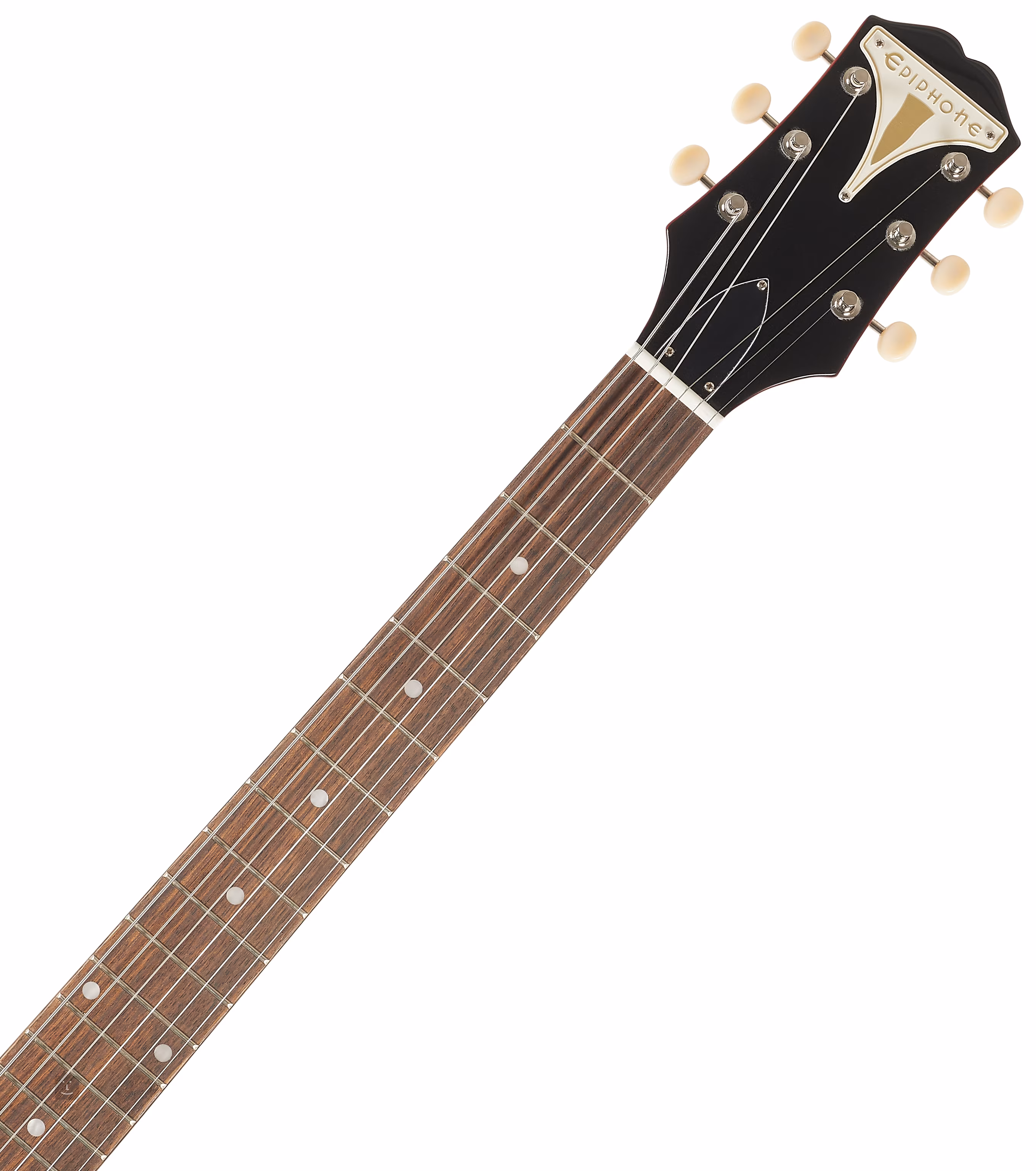 Zwei P-90-Tonabnehmer im Soapbar-Design verleihen der Gitarre einen durchdringenden, aber dennoch warmen Sound, der sich für eine Vielzahl von Musikstilen eignet - von Jazz und Blues bis hin zu Classic Rock und Punk. Der Klangcharakter lässt sich mit zwei Lautstärkepotentiometern, zwei Tonreglern und einem dreistufigen Pickup-Schalter einstellen. Die Saiten sind über das NuBone-Griffbrett in den firmeneigenen Stimmmechaniken mit Wirbeln aus Elfenbeinimitation und im LockTone Tune-O-Matic-Stoppstab verankert. Das originelle Design des Instruments wird durch das Butterfly Pickguard und Epiphones verkleinerte Kopfplatte aufgewertet.