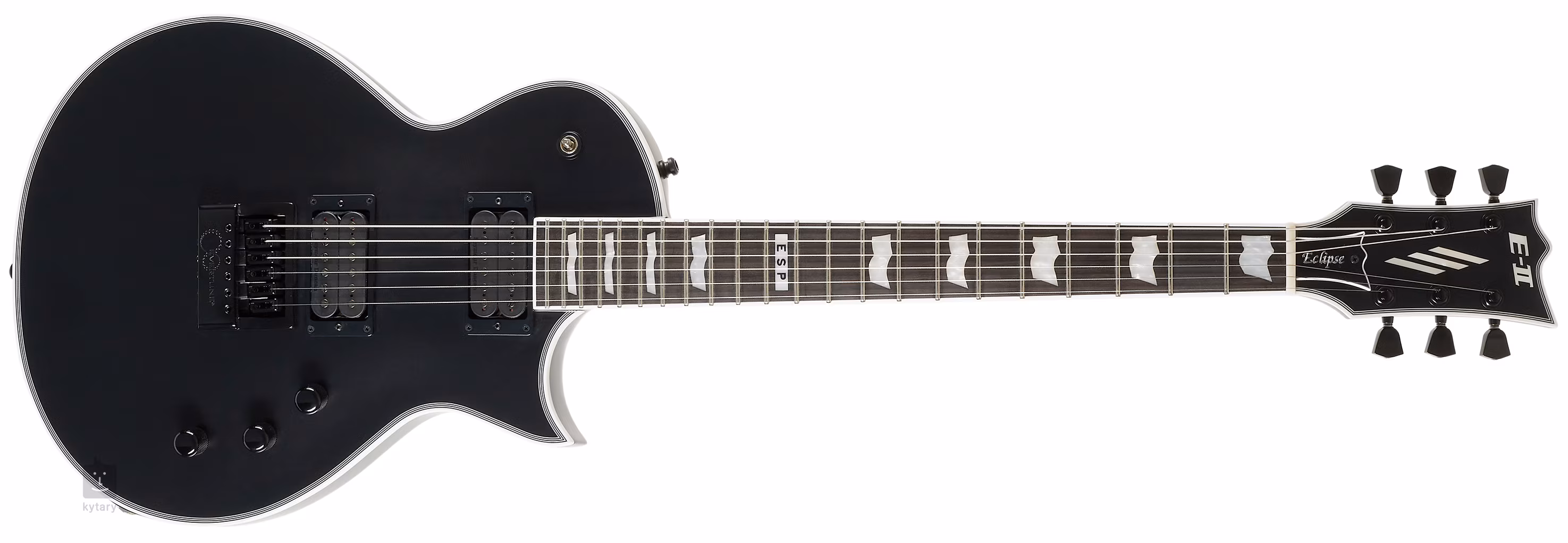 Die E-II Eclipse Evertune E-Gitarre ist eine Single-Cut-Gitarre, die auf den ersten Blick durch ihr kontrastreiches schwarzes Korpusdesign und das helle Binding mit schwarzen Linien auffällt. Der Korpus des Instruments ist aus Mahagoni gefertigt. Ein dreiteiliger Ahornhals mit einer Set-Thru-Konstruktion, d.h. einem tief in den Korpus eingelassenen Hals, und einem schmaleren U-Profil wird durch ein Ebenholz-Griffbrett mit zweiundzwanzig Extra-Jumbo-Bünden ergänzt. Die Orientierung auf der Oberfläche wird durch Positionsblöcke aus Perlmutt erleichtert.