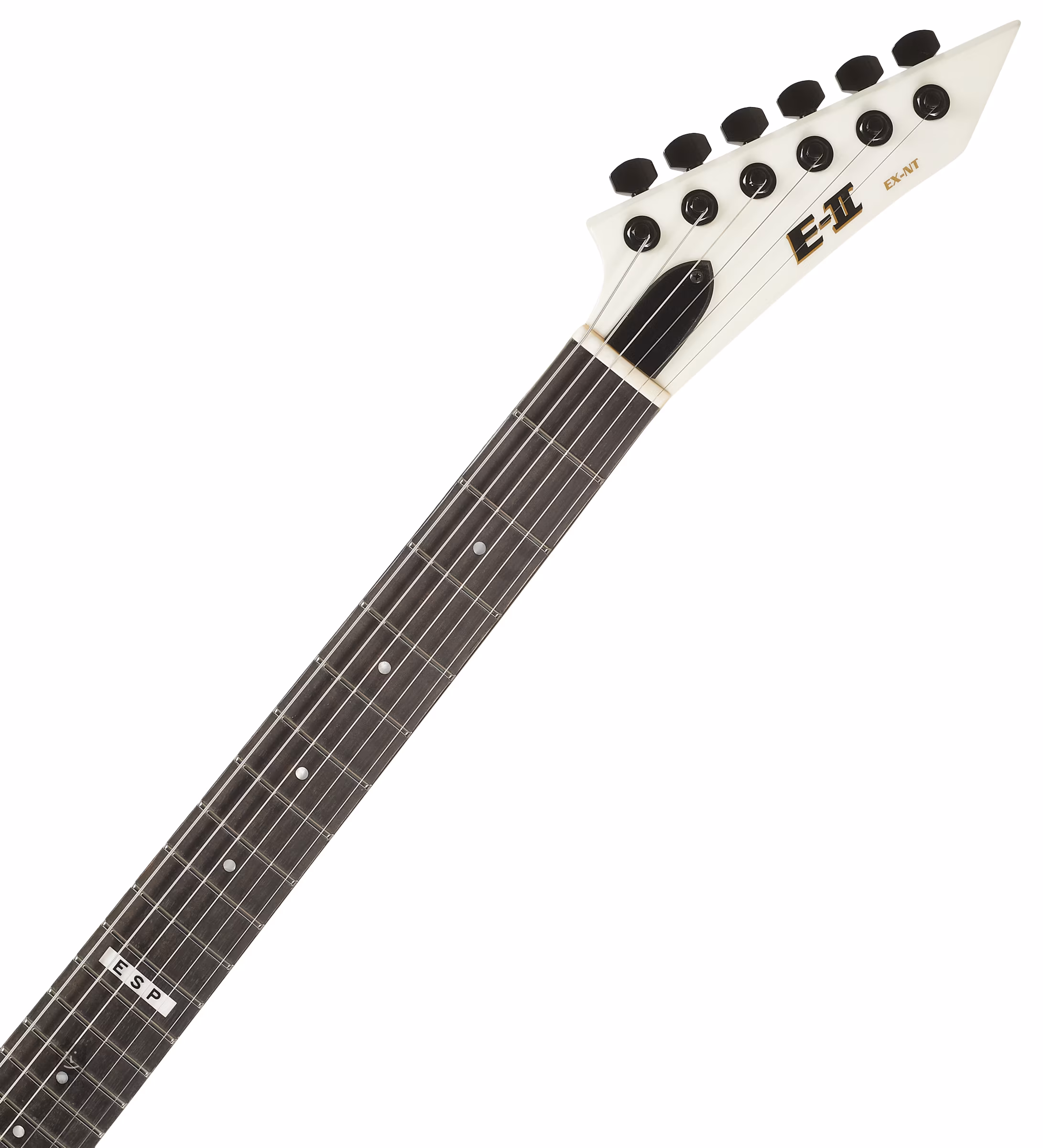 Das kompromisslos scharfe Design der E-II EX NT SW E-Gitarre basiert auf den bekannten Explorer-Modellen. Der Korpus des Instruments selbst ist aus Mahagoni gefertigt. Ein Ebenholz-Griffbrett mit zweiundzwanzig Extra-Jumbo-Bünden ist auf einen Mahagoni-Hals mit einer Set-Thru-Konstruktion geleimt, d.h. der Hals ist tiefer in den Korpus eingelassen. Die Orientierung auf der Oberfläche des Griffbretts wird durch Positionspunkte und ein ESP-Inlay am zwölften Bund erleichtert.