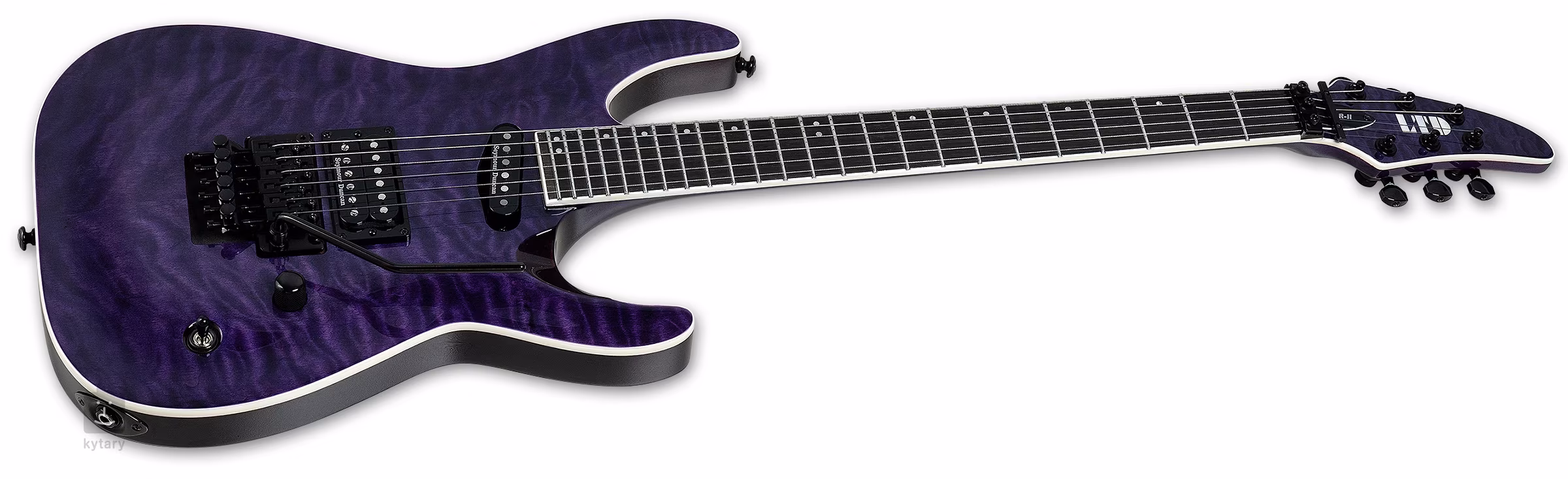 Die Konstruktion der Gitarre im modernen Super ST Horizon-Design besteht aus Mahagoni-Korpusflügeln, einer gesteppten Ahorndecke und einem dreiteiligen Ahornhals. Ein See Thru Purple Finish akzentuiert die Puffahornschnitzerei. Das Ebenholz-Makassar-Griffbrett ist mit vierundzwanzig Extra-Jumbo-Bünden aus Edelstahl ausgestattet. Sein Radius flacht zum Korpus hin ab - das ermöglicht sowohl komfortables Riffspiel am Nullbund als auch bequemes, ultraschnelles Shredden in höheren Lagen. Die Orientierung auf dem Griffbrett in der Dämmerung, selbst in den dunkelsten Ecken der Bühne, wird durch Leuchtpunkte an der Seite erleichtert.