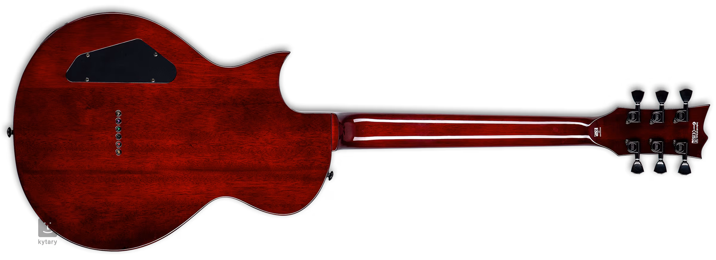 Der Flat-Top-Mahagoni-Korpus der EC-201 FT SEE THRU BLACK CHERRY wird durch einen dreiteiligen Mahagoni-Hals ergänzt. Zweiundzwanzig Extra-Jumbo-Bünde unterteilen das geröstete Jatoba-Griffbrett. Positionsblöcke aus Perlmutt-Imitat erleichtern die Orientierung auf dem Griffbrett.