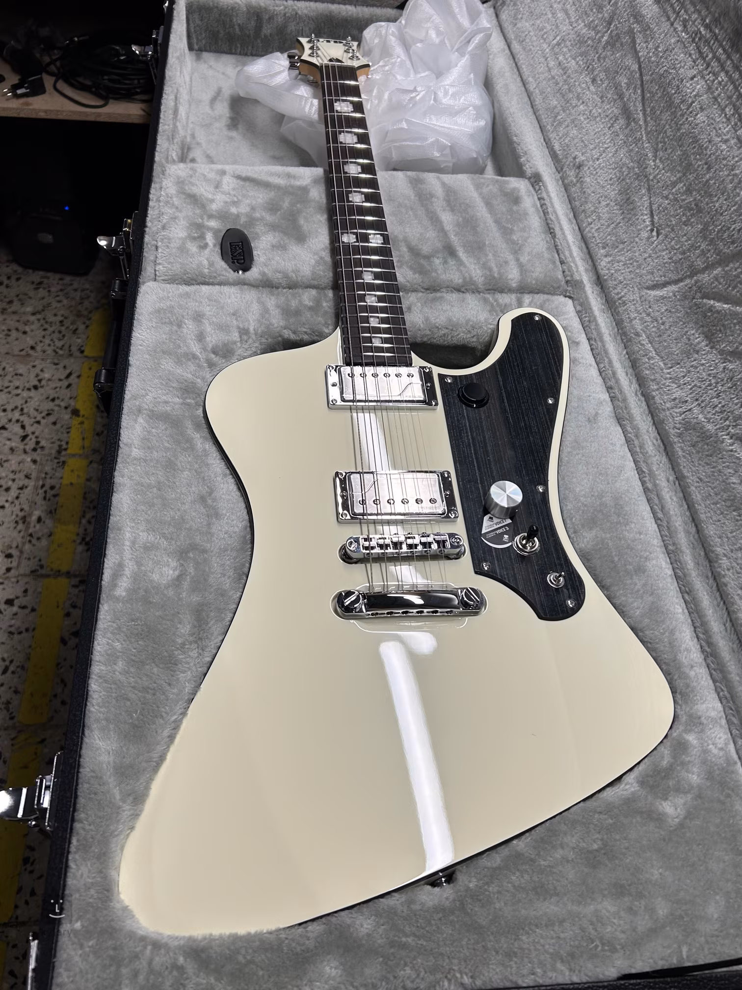 E-Gitarre ESP LTD Richard ZK RZK-III Olympic White ist ein Signature-Modell des Gitarristen Richard Z. Kruspe von der deutschen Band Rammstein. Das Instrument basiert auf dem versetzten ESP Phoenix-Design, das Richard ZK während der Dreharbeiten zum Emigrate-Projektvideo kennengelernt hat und das ihm so gut gefiel, dass er und die Leute von ESP beschlossen, ein Signature-Modell zu kreieren.