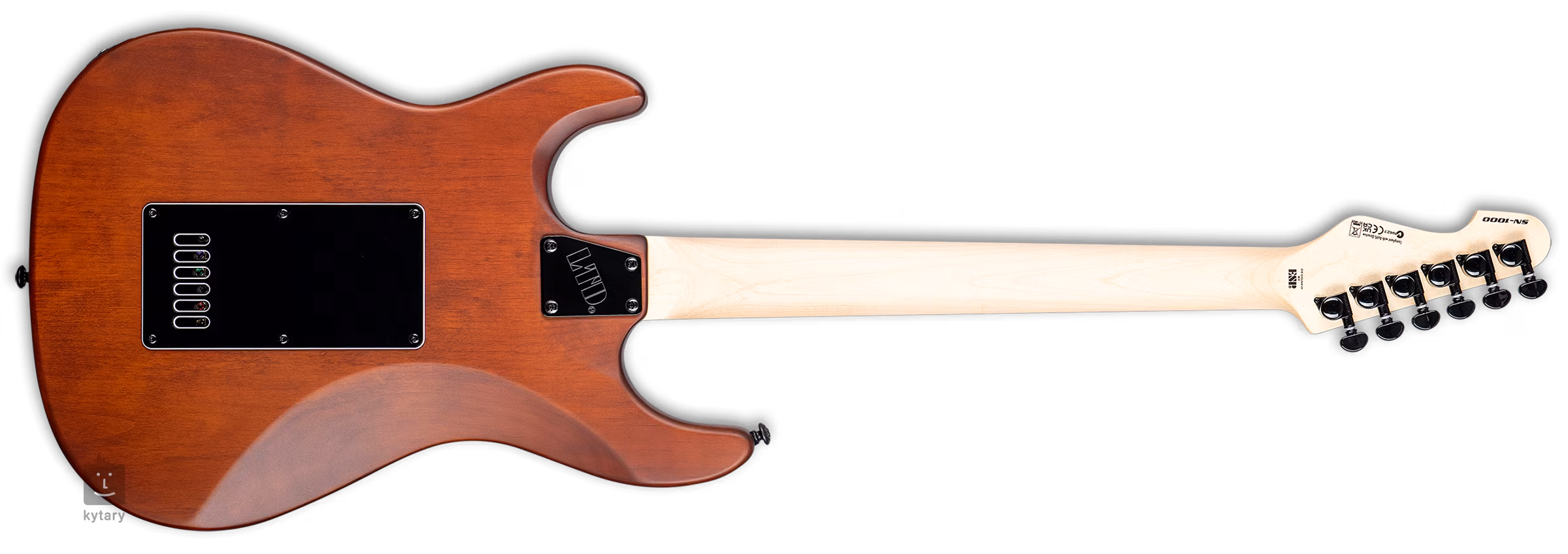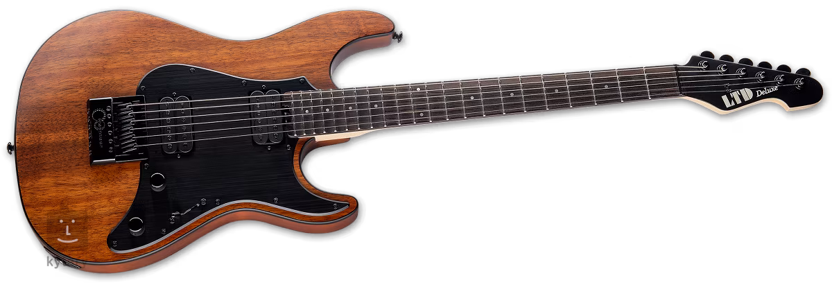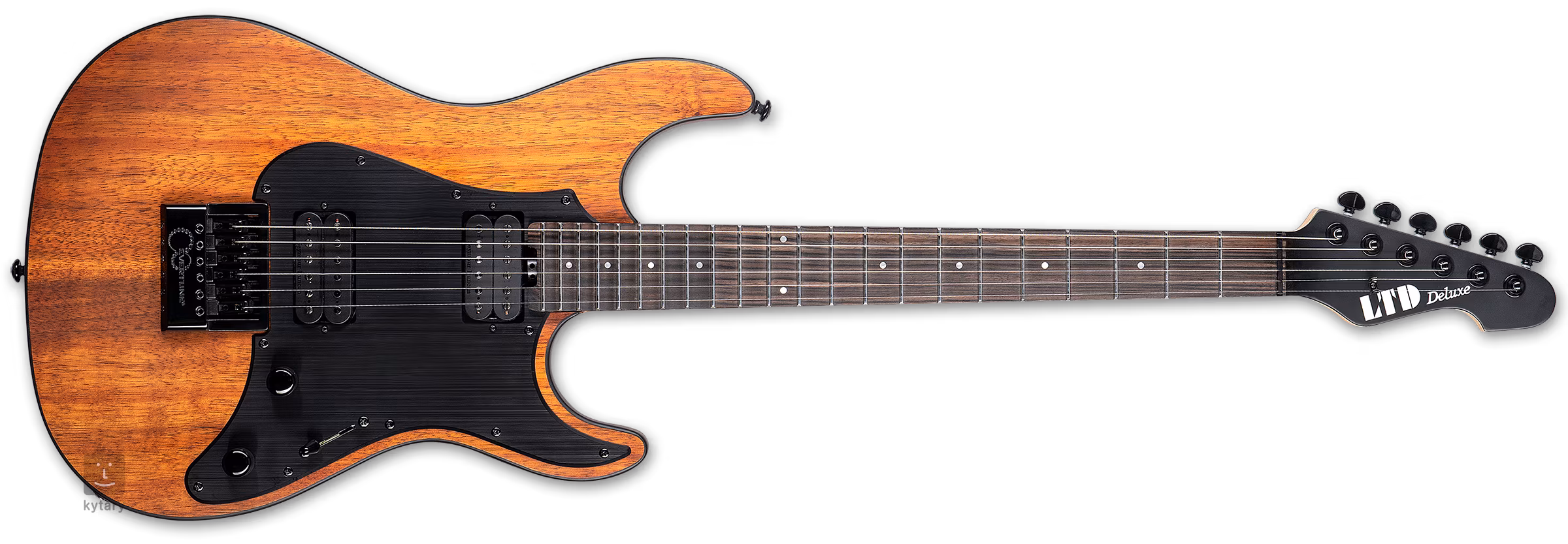 Der Mahagoni-Korpus der SN-1000 EVERTUNE KOA NATURAL SATIN ist mit einer hawaiianischen Koa-Decke versehen, wobei das Natural Satin-Finish die natürliche Maserung des Holzes nur dezent unterstreicht. Der verschraubte Ahornhals ist mit einem Griffbrett aus Makassar-Ebenholz verleimt, das mit zweiundzwanzig Extra-Jumbo-Bünden aus rostfreiem Stahl bestückt ist (das Griffbrett ist zwischen den Bünden 15-22 wählbar). Sein Radius flacht zum Korpus hin ab und ermöglicht sowohl komfortables Riffing am Nullbund als auch bequemes, ultraschnelles Shredden in höheren Lagen. Die Orientierung auf dem Griffbrett wird durch Positionspunkte aus Perlmutt erleichtert.